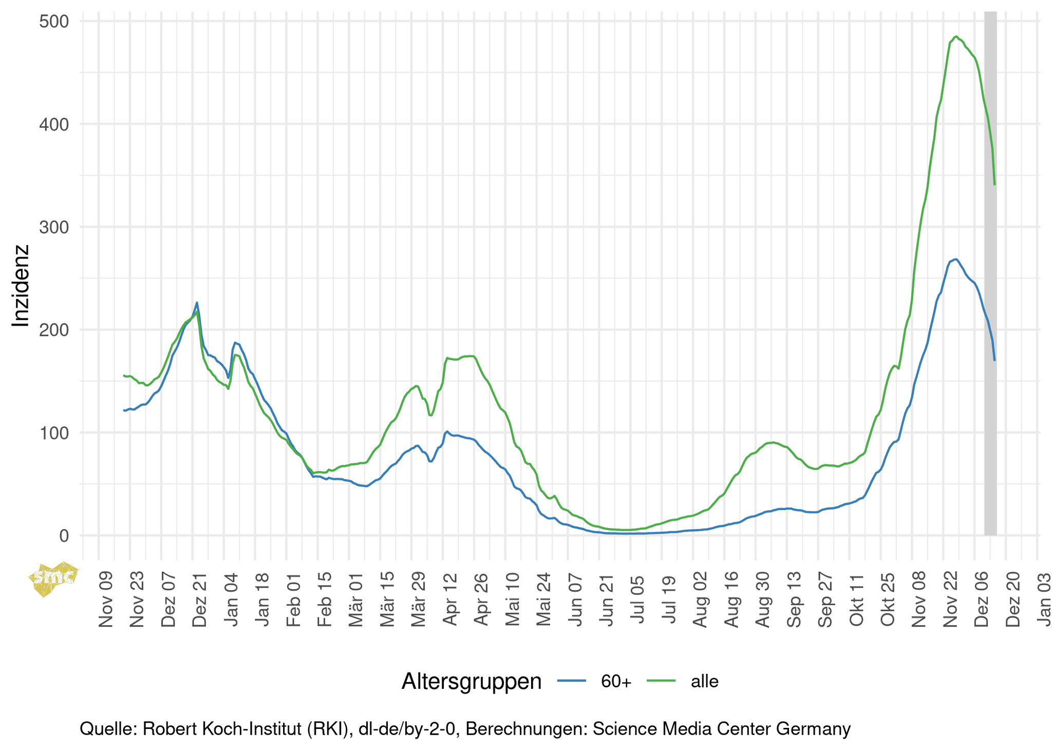 Der Rückgang der Inzidenzen ist besonders in den oberen Altersgruppen stark.