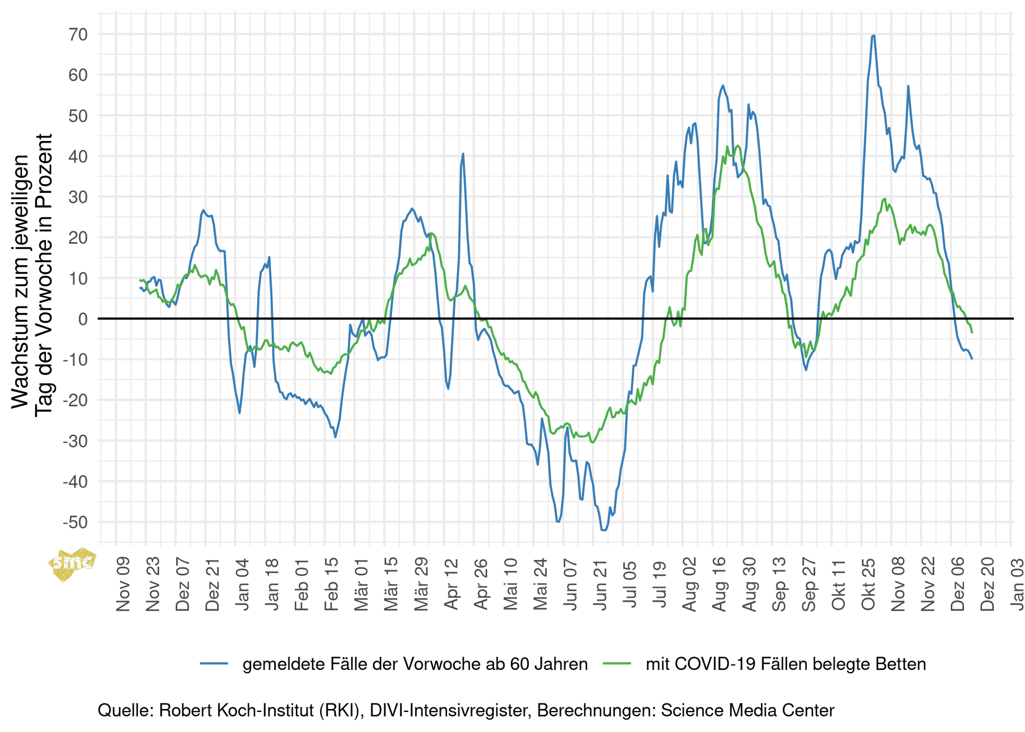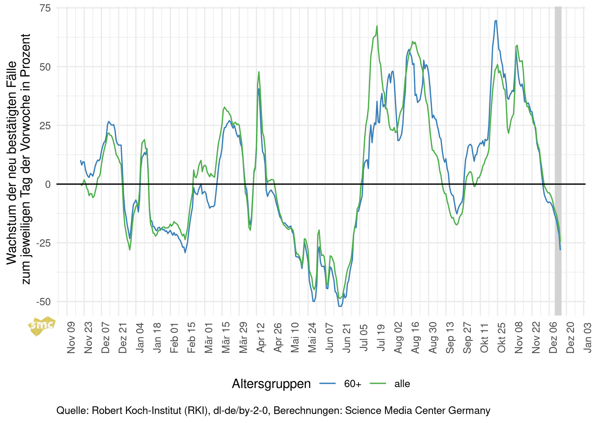 Die Grafik zeigt für jeden Tag das prozentuale Wachstum der geglätteten Fallzahlen im Vergleich zur Vorwoche. Dabei werden einmal alle gemeldeten Fälle berücksichtigt und einmal nur Fälle mit einem Alter von mindestens 60 Jahren. Das Wachstum ist inzwischen negativ, insbesondere in der Altersgruppe ab 60 Jahren gehen die Inzidenzen aktuell deutlich zurück.