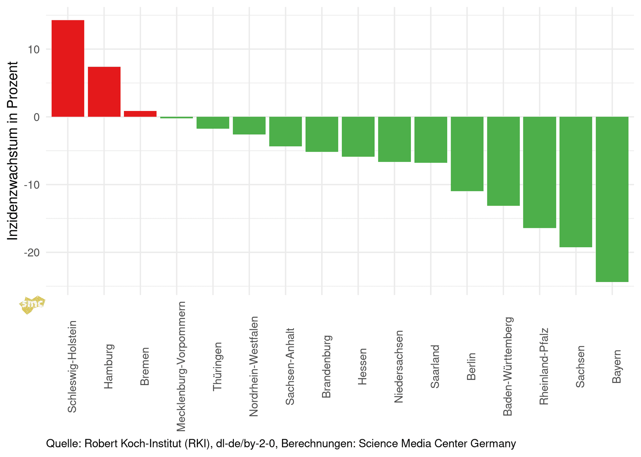 Im Folgenden wird das Wachstum der Inzidenz vom 11.12.2021 im Vergleich zur Vorwoche betrachtet. In fast allen Bundesländern sinken die Inzidenzen. In Bayern und Sachsen gehen die Inzidenzen besonders stark zurück.