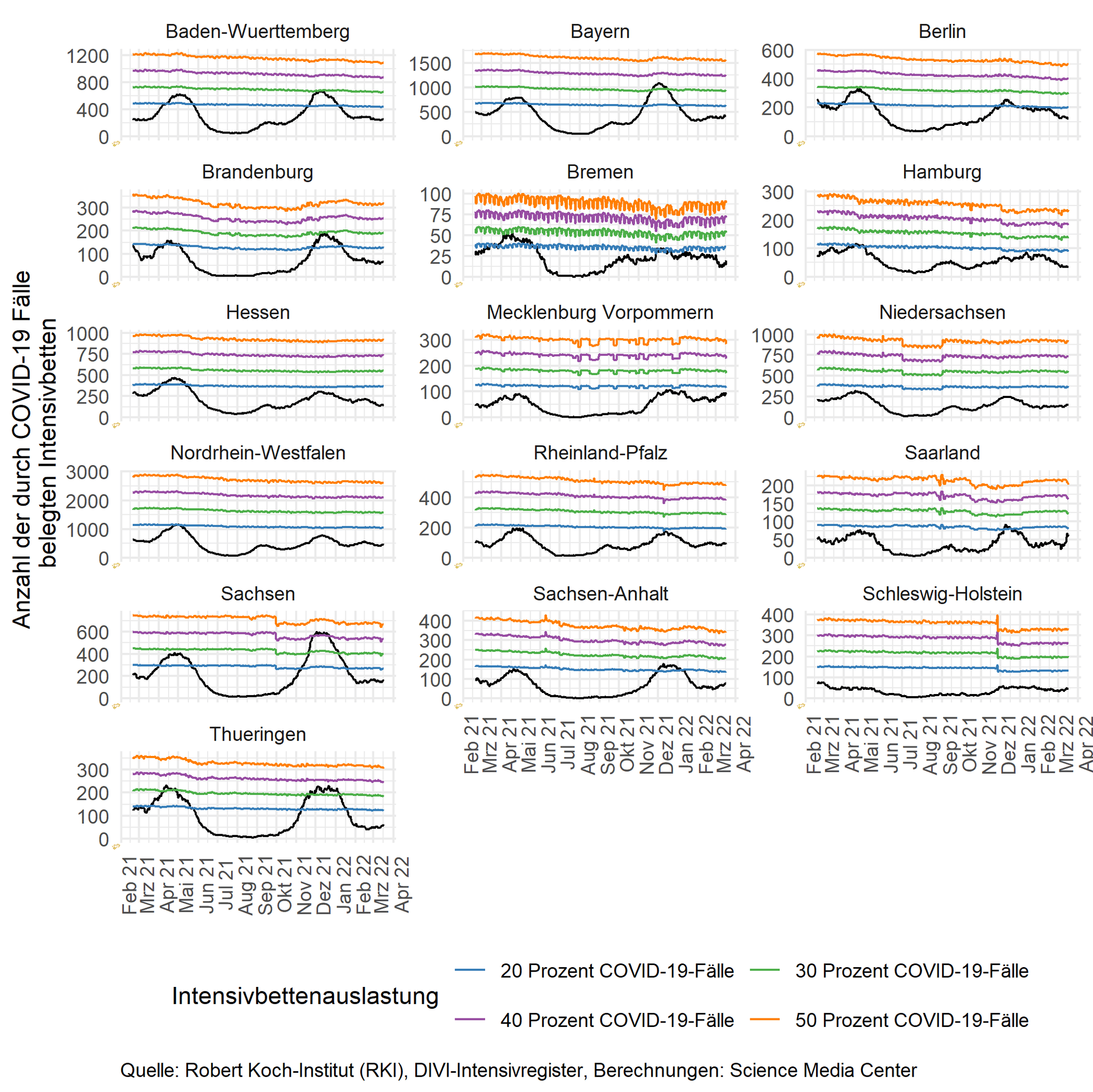 Schaut man sich nach Bundesländern an, wie die Intensivstationen ausgelastet sind, lag im vergangenen Winter das jeweilige Maximum auf einem anderen relativen Niveau. Während Berlin und Sachsen in der Spitze eine Auslastung von etwa 40 Prozent erreichten, waren in Schleswig-Holstein nicht einmal 20 Prozent der gemeldeten Intensivbetten mit COVID-19-Fällen belegt. Die relative Grenze schwankt dabei über die Zeit, da nicht an jedem Tag gleich viele verfügbare Betten gemeldet werden. Um die relative Belastung vergleichen zu können, werden auf der Y-Achse unterschiedliche absolute Skalen verwendet. In allen Bundesländern liegt die durch COVID-19-Fälle verursachte Auslastung der Intensivbetten unter 20 Prozent.