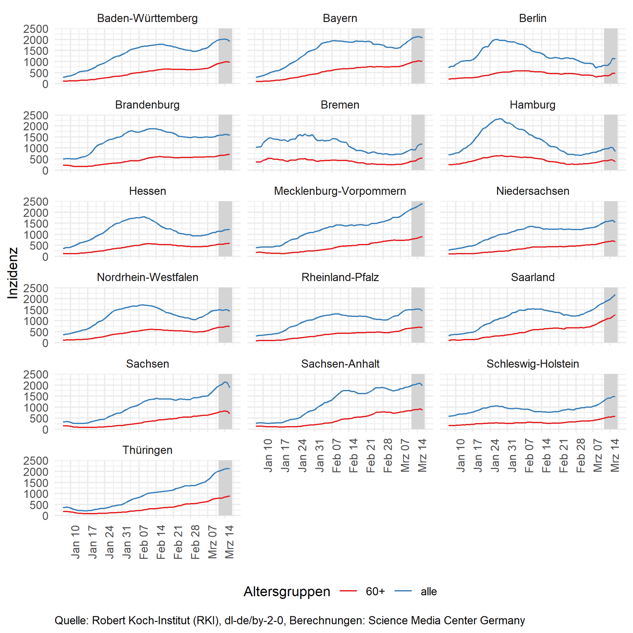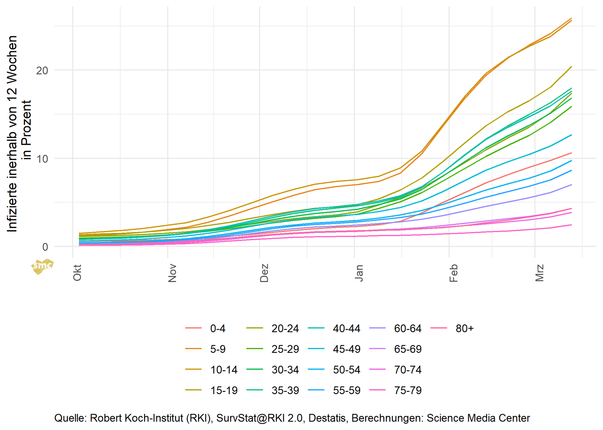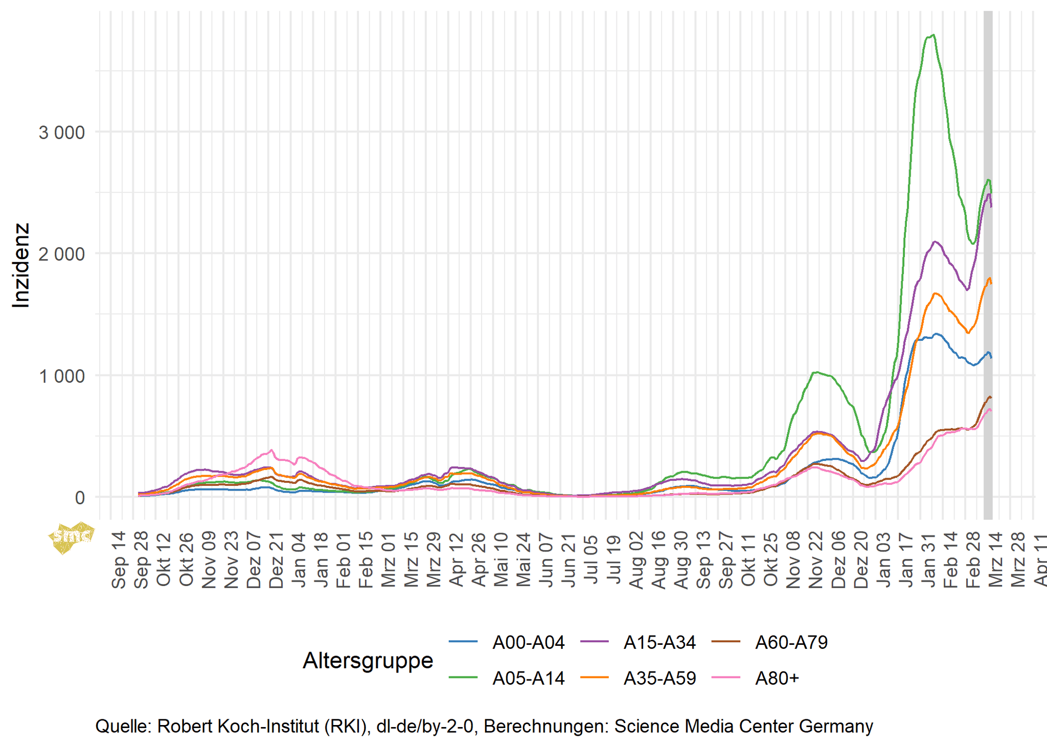 Die Inzidenzen steigen in allen Altersgruppen. Mit das höchste Wachstum verzeichnen die oberen Altersgruppen.