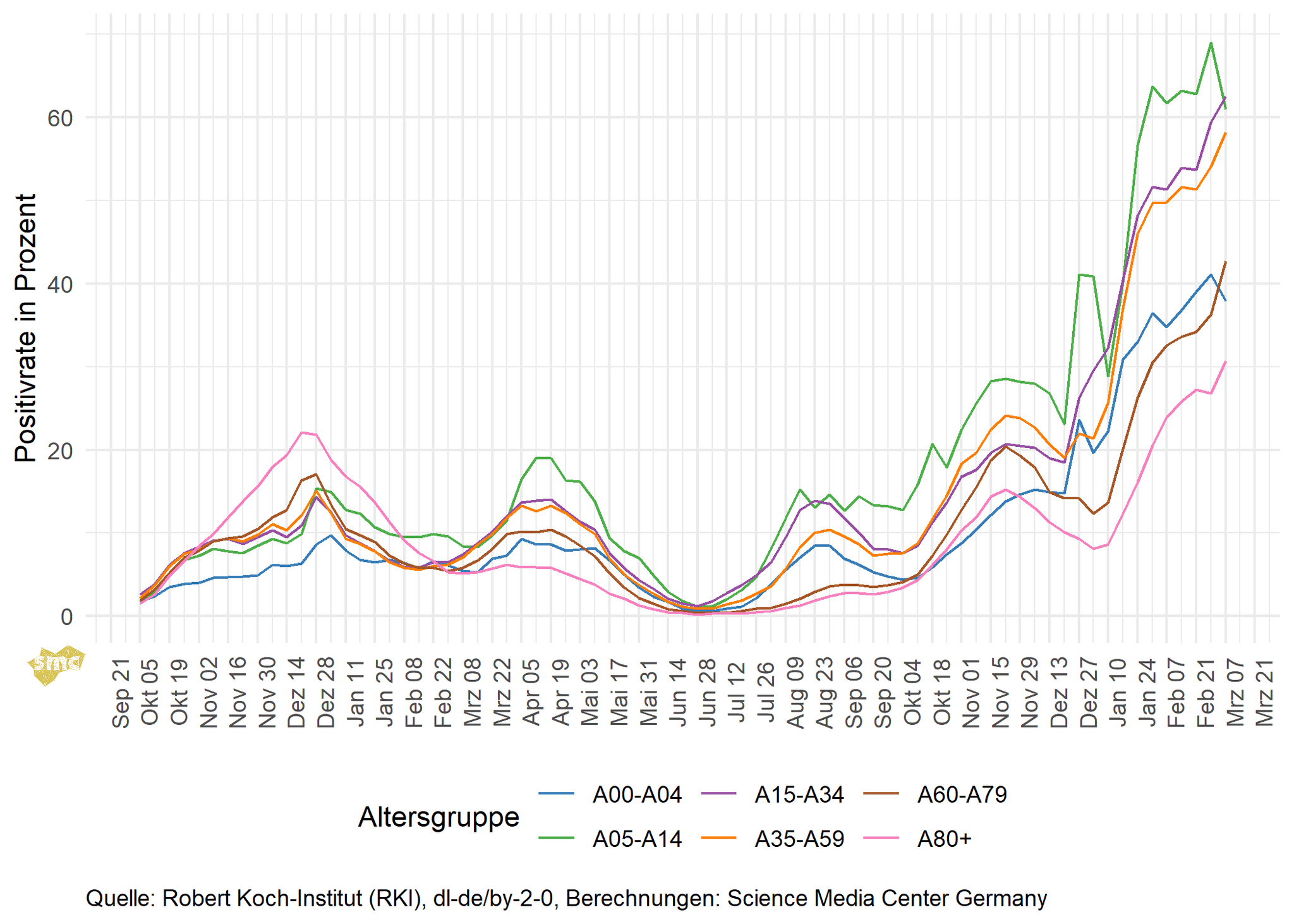 Die Testpositivrate lag in der vergangenen Woche laut ALM e.V. bei 53,9 Prozent und ist damit erneut gestiegen. Die Betrachtung der Altersgruppen zeigt aber ein uneindeutiges Bild. In den beiden Altersgruppen unter 15 Jahren ist die Testpositivrate leicht gesunken. Hier wurde aber auch die Zahl der durchgeführten Tests deutlich erhöht, sodass nicht direkt auf einen Rückgang des Infektionsgeschehens geschlossen werden kann.