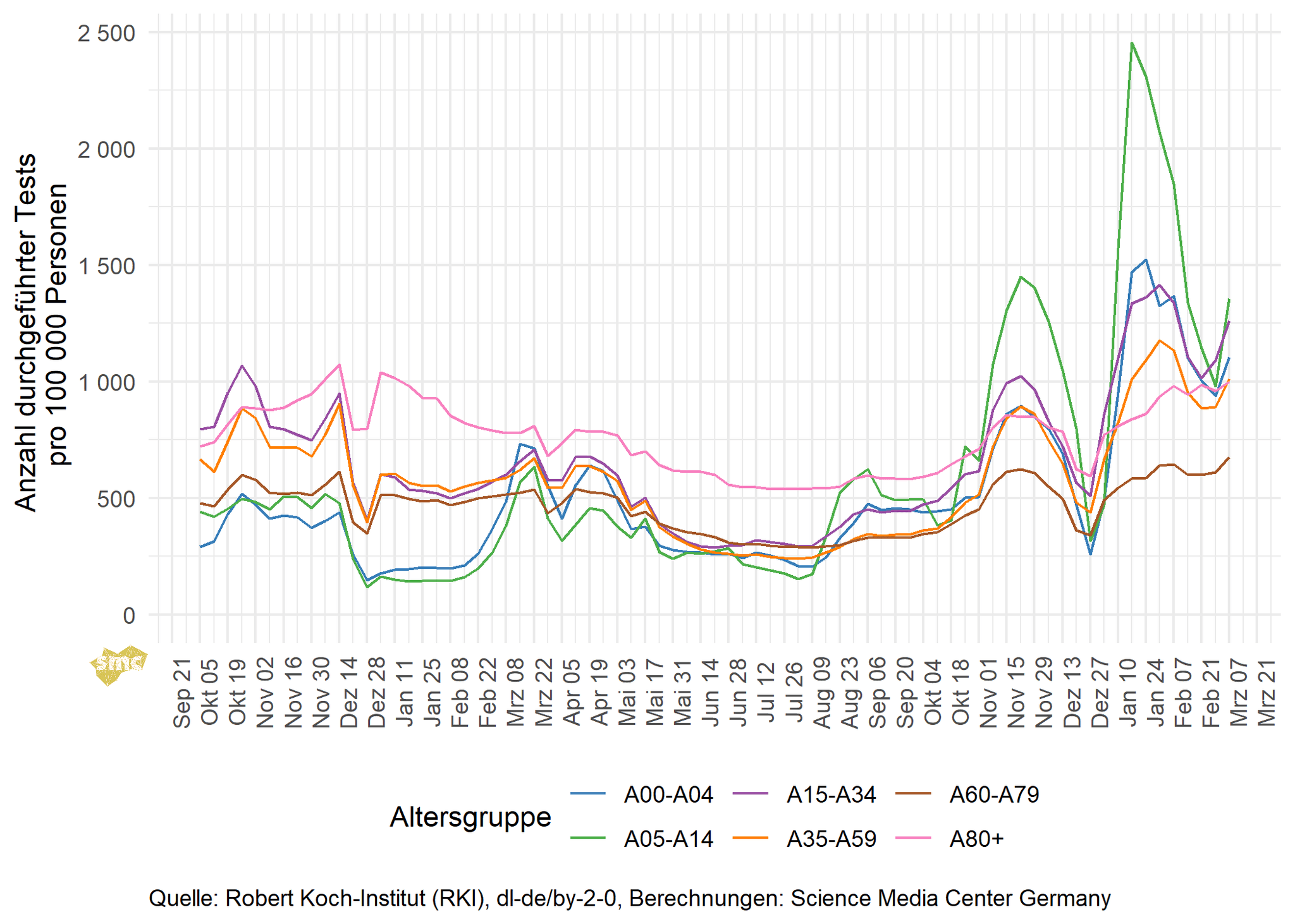 Die Testpositivrate steigt in den Altersgruppen ab 15 Jahren, darunter sinkt sie leicht.