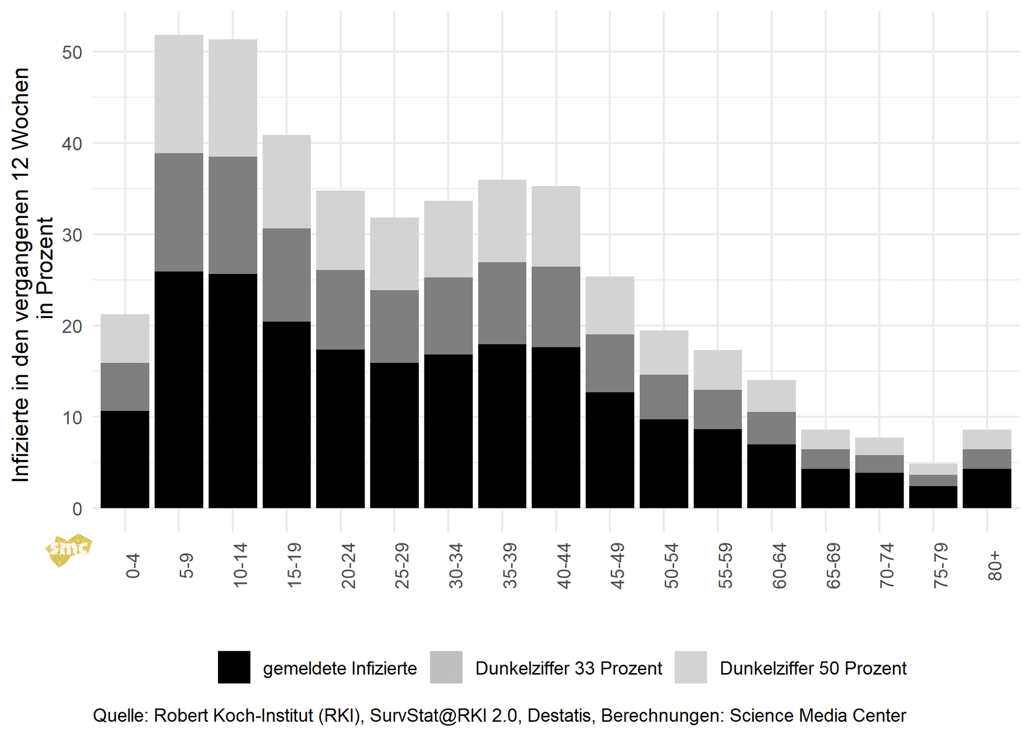 Die hohen Inzidenzen können auch wieder dazu führen, dass eine Überlastung zu zusätzlicher Meldeverzögerung oder einer höheren Dunkelziffer führt. Durch die hohe Testpositivrate ist die Auslastung der Labore noch nicht so hoch wie Anfang Februar, aber auch hier steigt die Auslastung wieder schnell. Stagnierende oder sinkende Inzidenzen müssen in den kommenden Tagen also wieder hinterfragt werden. Davon unabhängig sind in den kommenden Wochen aber auch weiterhin real sinkende Fallzahlen zu erwarten, da nun auch der Anteil der in den vergangenen 12 Wochen infizierten Personen in den mittleren Altersgruppen zuletzt deutlich angestiegen ist und sich bei einer angenommenen Dunkelziffer von 50 Prozent zwischen 30 und 40 Prozent bewegt.