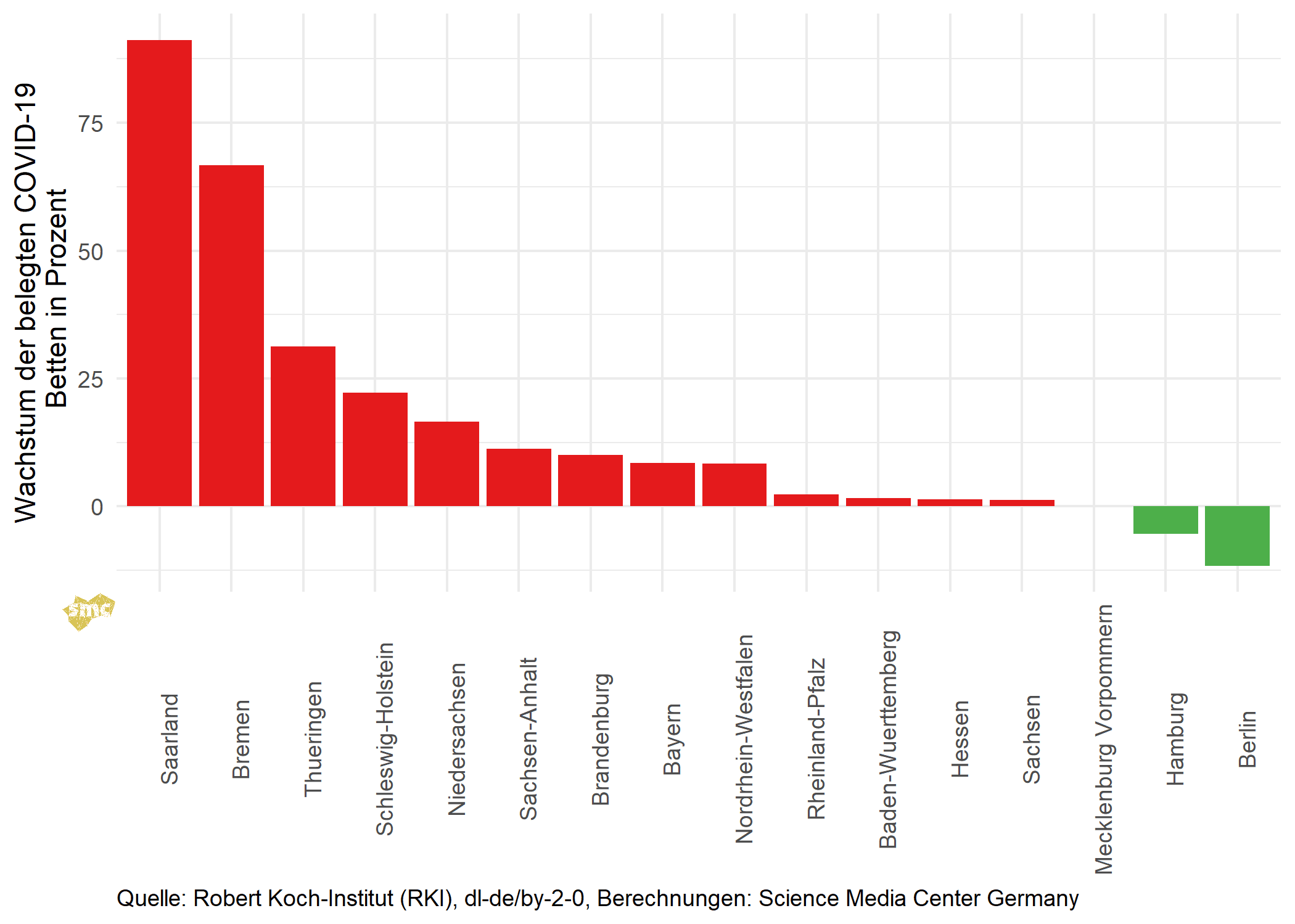 Der Trend der Belegung auf den Intensivstationen ist für die meisten Bundesländer steigend. Hohes Wachstum verzeichnen aktuell nur kleine Bundesländer.