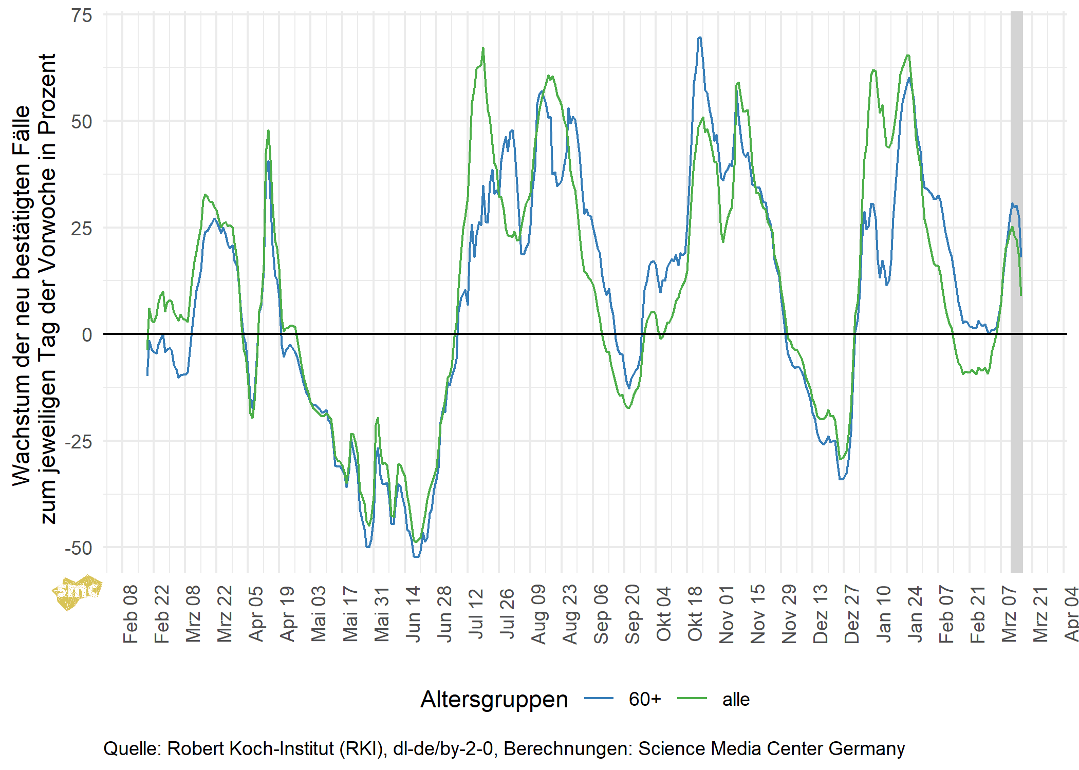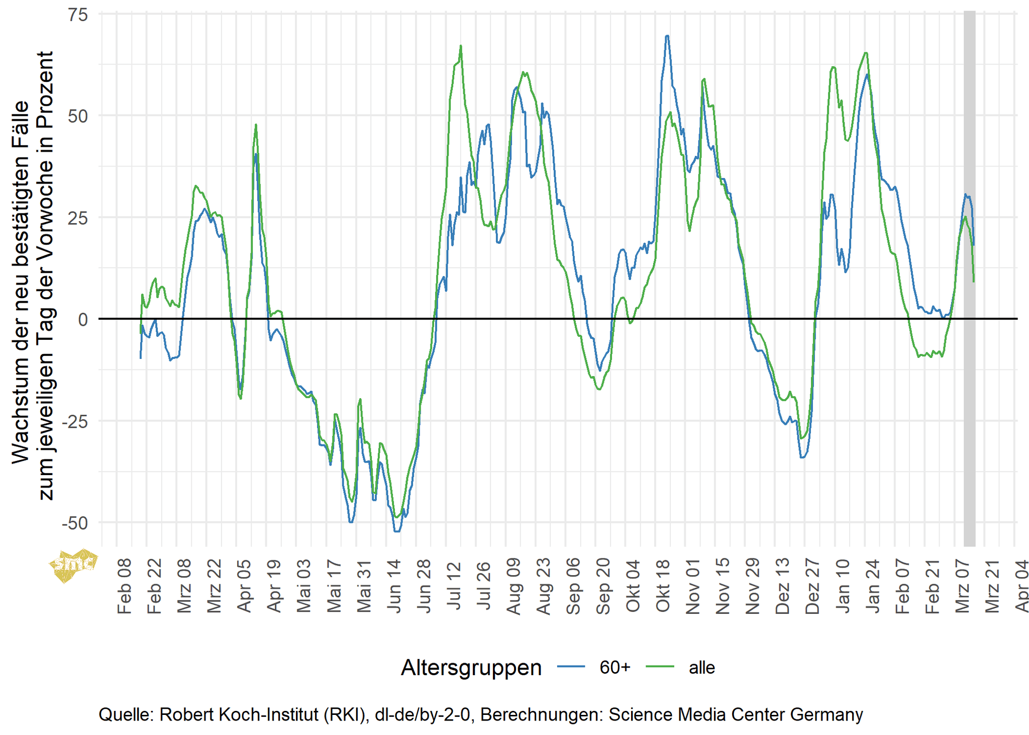 Die Grafik zeigt für jeden Tag das prozentuale Wachstum der geglätteten Fallzahlen im Vergleich zur Vorwoche. Dabei werden einmal alle gemeldeten Fälle berücksichtigt und einmal nur Fälle mit einem Alter von mindestens 60 Jahren. Das Wachstum in der Altersgruppe ab 60 Jahren ist aktuell wieder größer als das Gesamtwachstum.