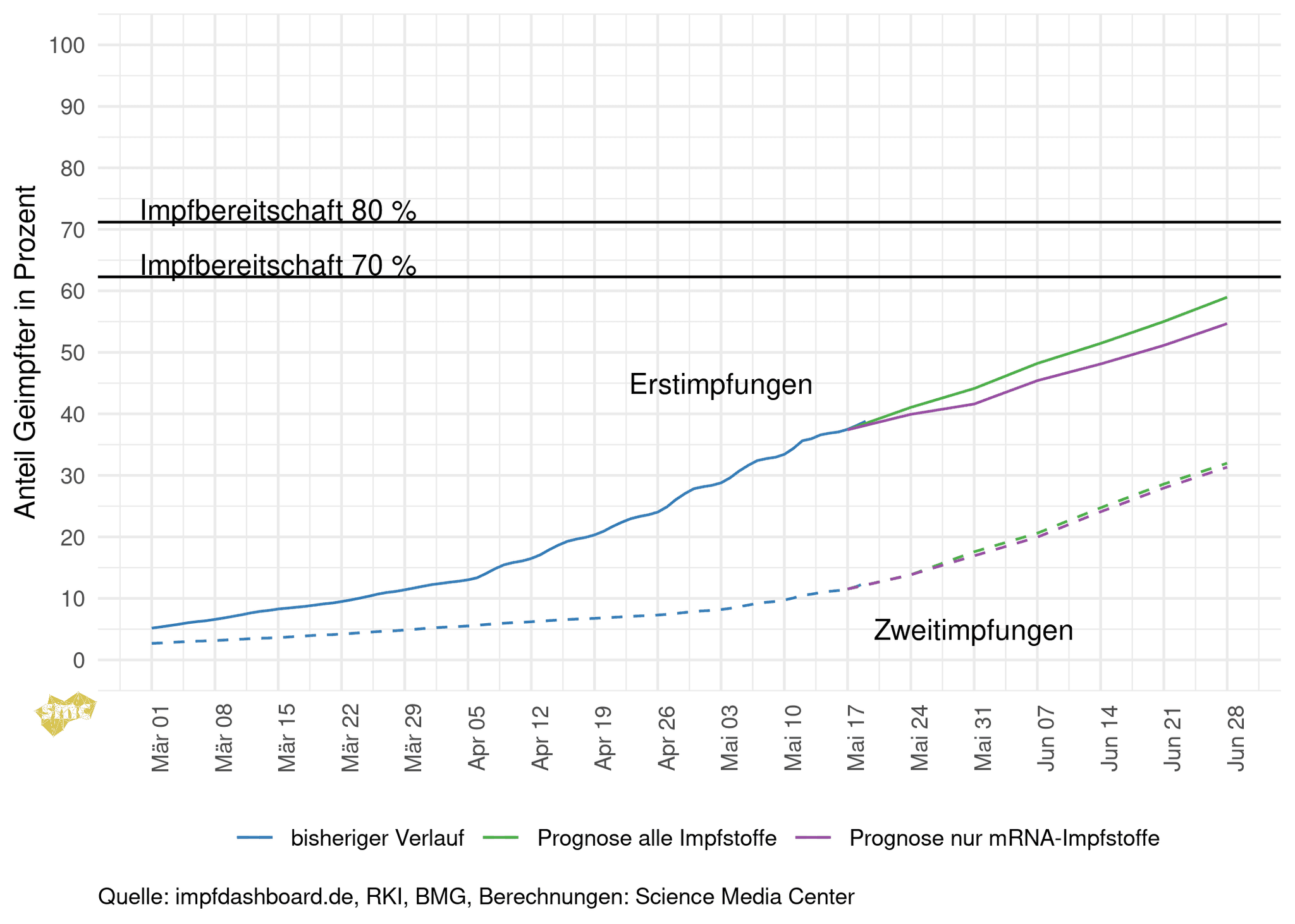 Die beiden schwarzen Linien in der Grafik markieren die erreichbaren Impfquoten, wenn alle Personen ab 12 Jahren eine Impfbereitschaft von 80 Prozent beziehungsweise 70 Prozent zeigen. In Erwartung der Zulassung des BioNTech-Impfstoffs ab 12 Jahren wurde dies als die relevante Altersgrenze für das zweite Quartal gewählt.