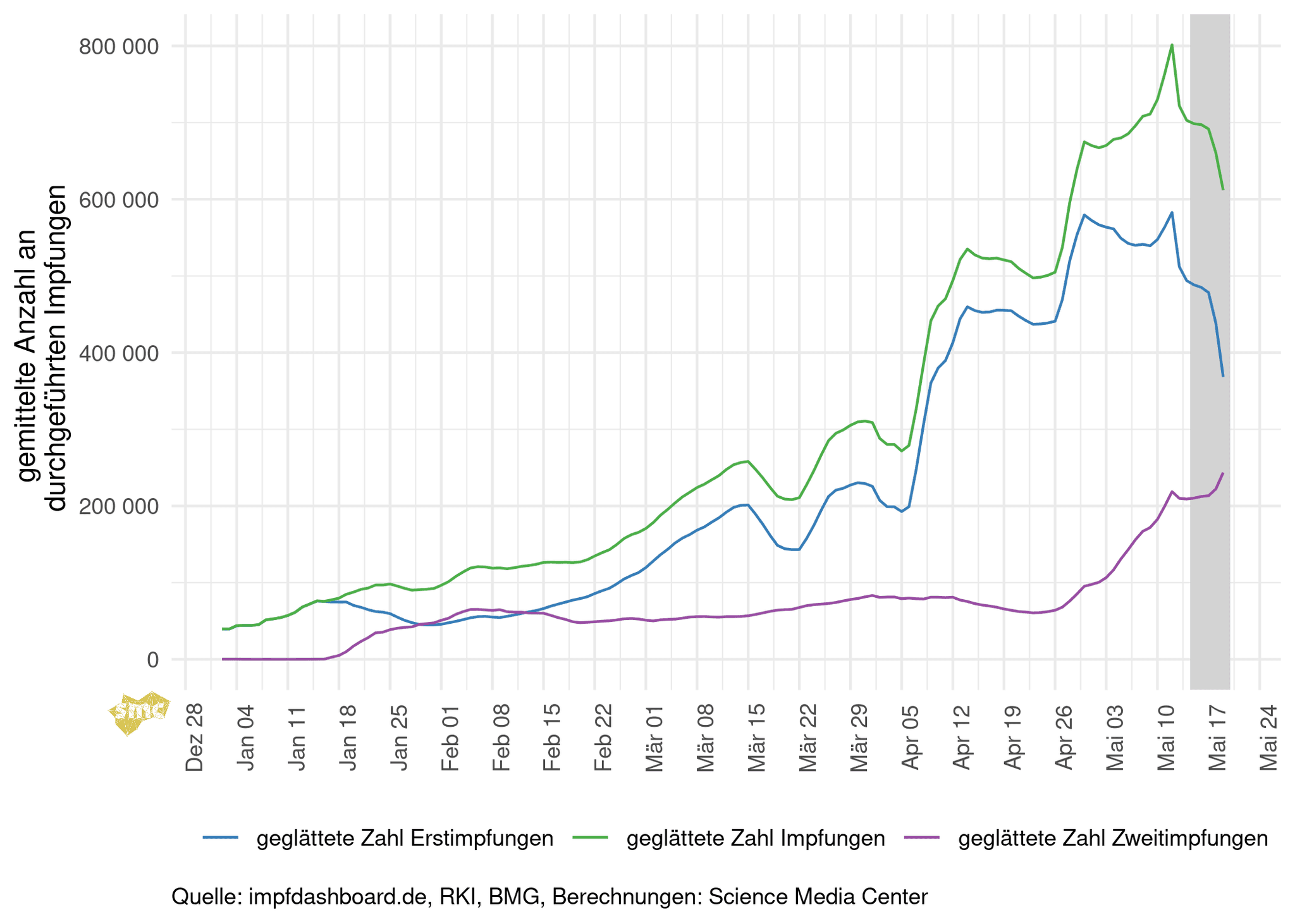 Da immer mehr Impfstoff verfügbar ist, kann sich auch das Impftempo beschleunigen. Die Grafik zeigt den über sieben Tage geglätteten Verlauf der täglichen Impfungen insgesamt und nach Erst- beziehungsweise Zweitimpfung getrennt. In den kommenden Wochen wird die Zahl der benötigten Zweitimpfungen stark steigen. In der zweiten Mai-Hälfte sinkt die Zahl der durchgeführten Erstimpfungen deswegen.