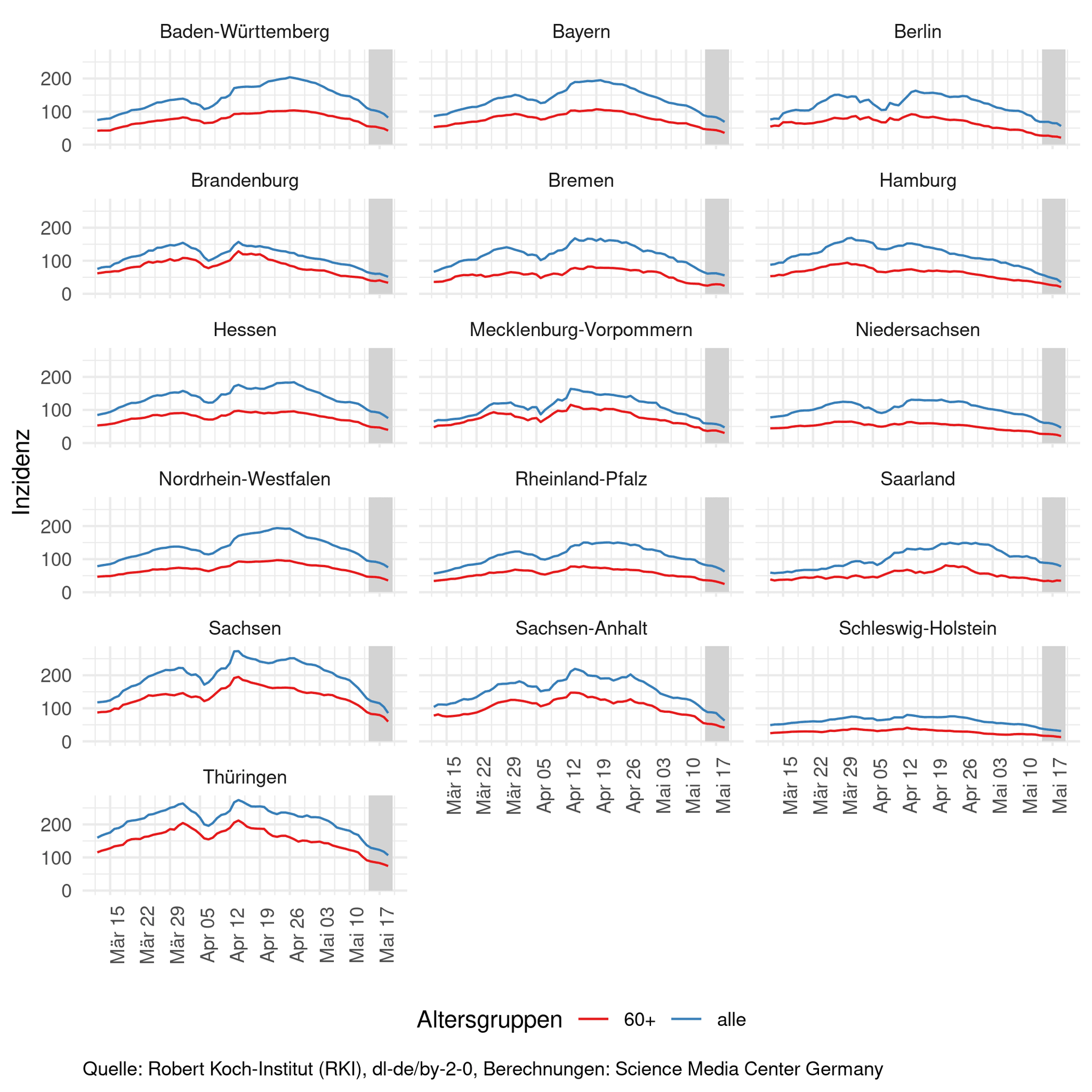 Der Rückgang der Inzidenzen und der Intensivbettenbelegung mit COVID-19-Fällen hat sich fortgesetzt. Die Inzidenzen gehen sowohl in allen Bundesländern, als auch in allen Altersklassen zurück. Durch den Feiertag in der vergangenen Woche und die kommenden Feiertage gibt es bei den Inzidenzen und deren Wachstum aktuell größere Schwankungen. So ist der aktuell stärkere Rückgang der Inzidenzen zumindest zu einem Teil dem Feiertag der vergangenen Woche geschuldet. In den kommenden Tagen kann der Rückgang zu niedrig ausfallen, da die aktuelle vollständige Woche dann mit einer Woche mit Feiertag verglichen wird. Mit dem Eintreffen der Daten für Pfingstmontag wird sich dieser Effekt dann temporär ausgleichen, bis am darauf folgenden Freitag Christi Himmelfahrt aus dem Vergleichszeitraum herausfällt und damit das Wachstum wieder etwas zu niedrig ausfallen dürfte. Der kommende Feiertag in einigen bevölkerungsreichen Bundesländern an Fronleichnam setzt dieses Muster fort. Unabhängig davon ist aber der aktuelle deutliche Rückgang der Inzidenzen nicht hauptsächlich durch diese Feiertage erklärbar, nur bei der Interpretation der täglichen Schwankungen muss dieser Effekt zusätzlich beachtet werden.