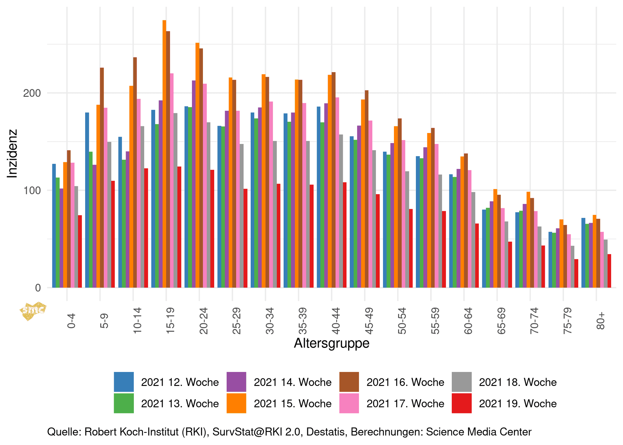Die Grafik zeigt die Inzidenzen in den Altersgruppen nach Kalenderwoche.