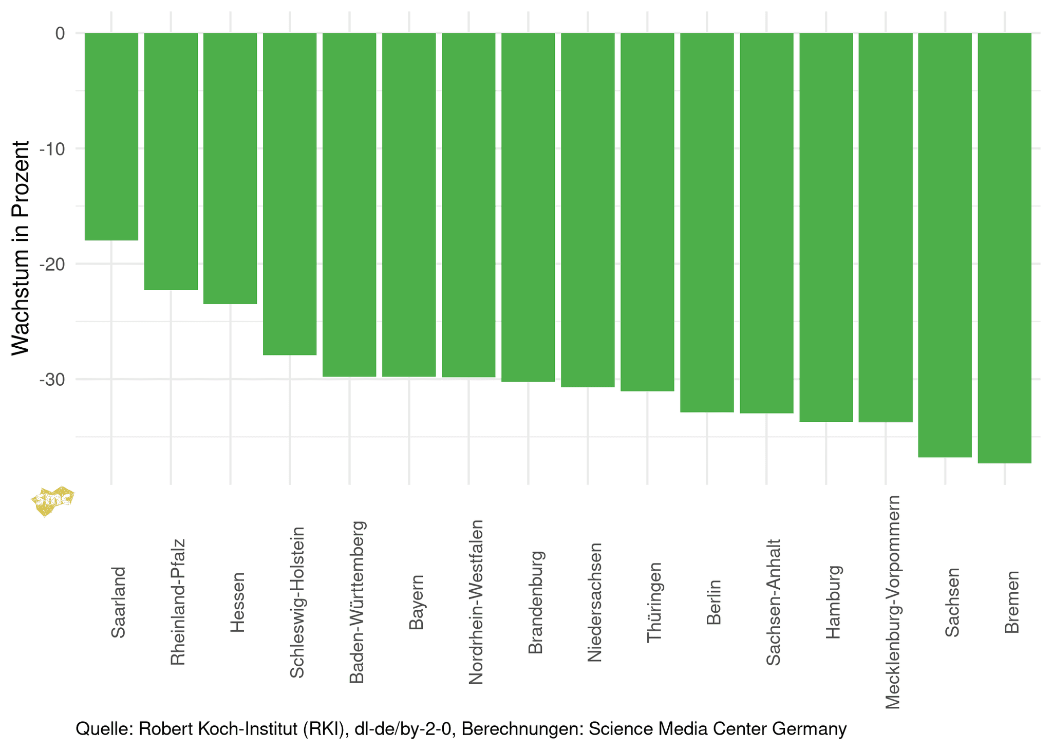 Im Folgenden wird das Wachstum der Inzidenz vom 15.05.2021 im Vergleich zur Vorwoche betrachtet. Der Rückgang der Inzidenzen in den Bundesländern ist unteschiedlich schnell, vergleicht man aber die Grafiken der letzten beiden Berichte, sieht man, dass die Reihenfolge der Bundesländer von Woche zu Woche verschieden ist.