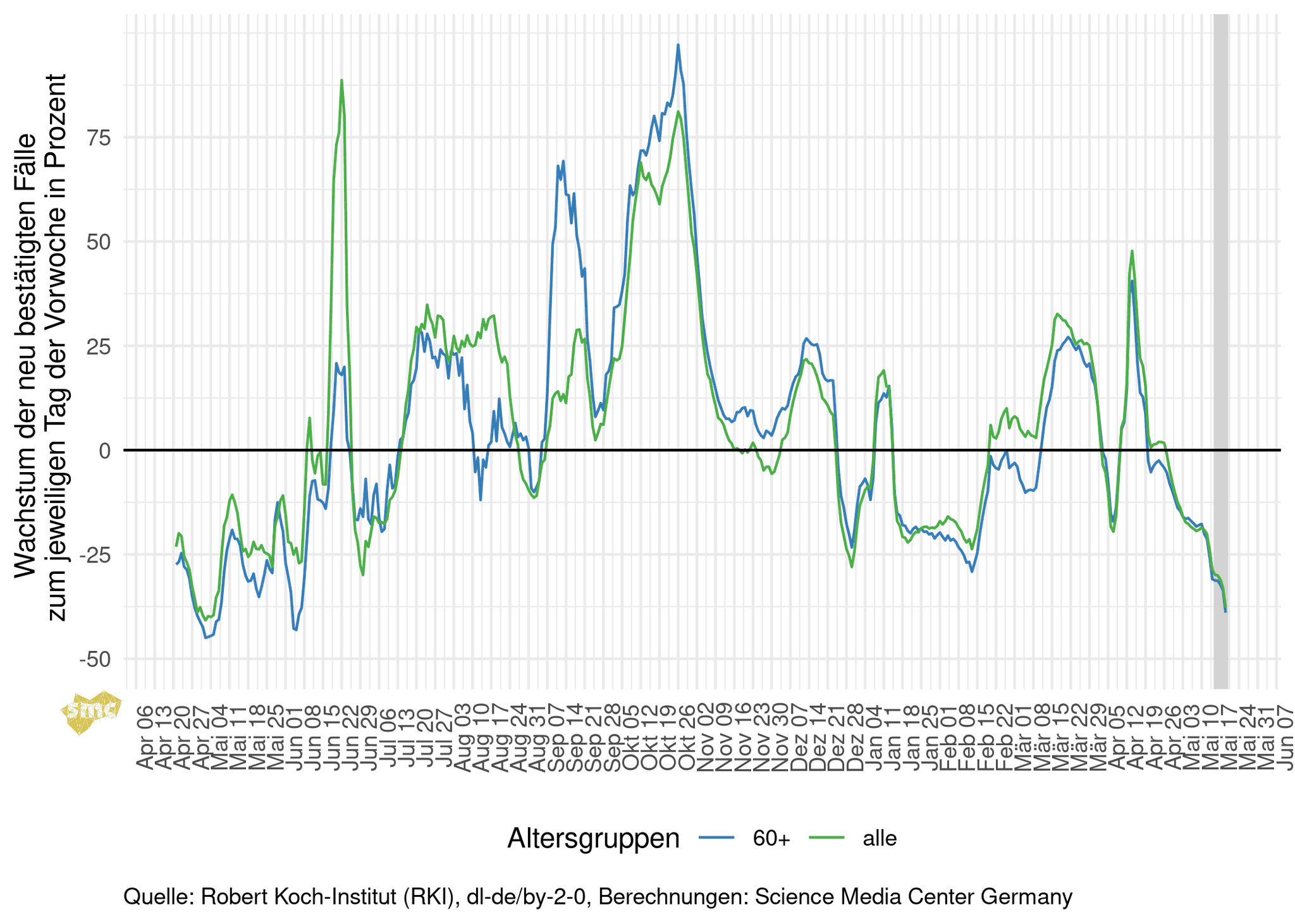 Die Grafik zeigt für jeden Tag das prozentuale Wachstum der geglätteten Fallzahlen im Vergleich zur Vorwoche. Dabei werden einmal alle gemeldeten Fälle berücksichtigt und einmal nur Fälle mit einem Alter von mindestens 60 Jahren. Das Wachstum ist negativ und sinkt aktuell weiter. Ein Teil der Entwicklung wird allerdings auf den Feiertag in der vergangenen Woche zurückgehen.