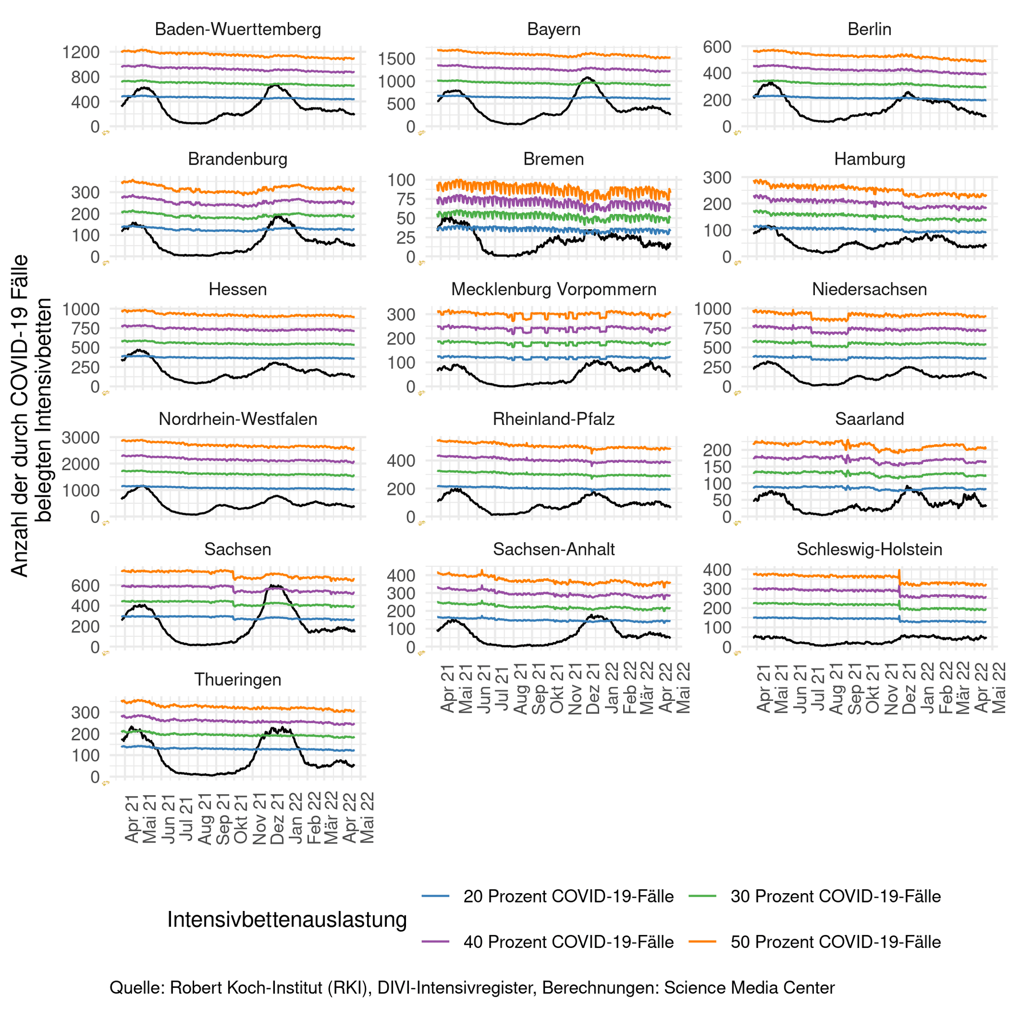 Schaut man sich nach Bundesländern an, wie die Intensivstationen ausgelastet sind, lag im vergangenen Winter das jeweilige Maximum auf einem anderen relativen Niveau. Während Berlin und Sachsen in der Spitze eine Auslastung von etwa 40 Prozent erreichten, waren in Schleswig-Holstein nicht einmal 20 Prozent der gemeldeten Intensivbetten mit COVID-19-Fällen belegt. Die relative Grenze schwankt dabei über die Zeit, da nicht an jedem Tag gleich viele verfügbare Betten gemeldet werden. Um die relative Belastung vergleichen zu können, werden auf der Y-Achse unterschiedliche absolute Skalen verwendet. In allen Bundesländern liegt die durch COVID-19-Fälle verursachte Auslastung der Intensivbetten unter 20 Prozent.