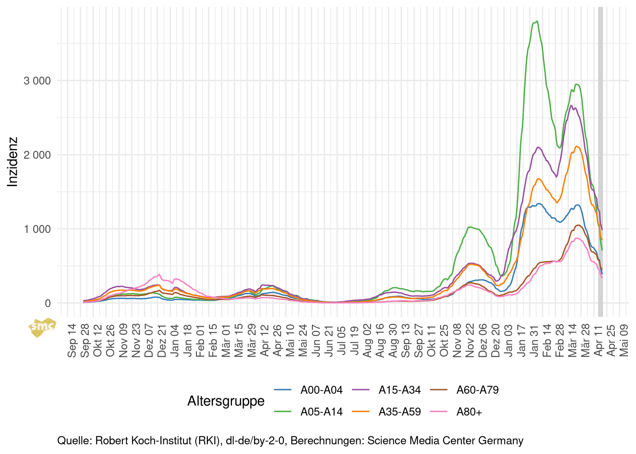 In allen Altersgruppen gehen die Inzidenzen durch die Feiertage deutlich zurück. In den unteren Altersgruppen dürften auch ausfallende Schultestungen in den Ferien eine Ursache sein.