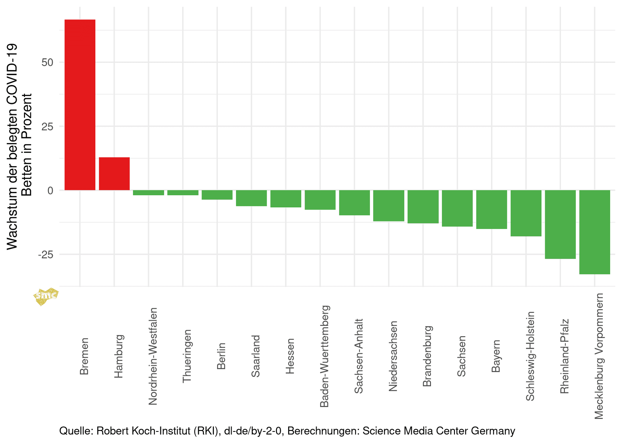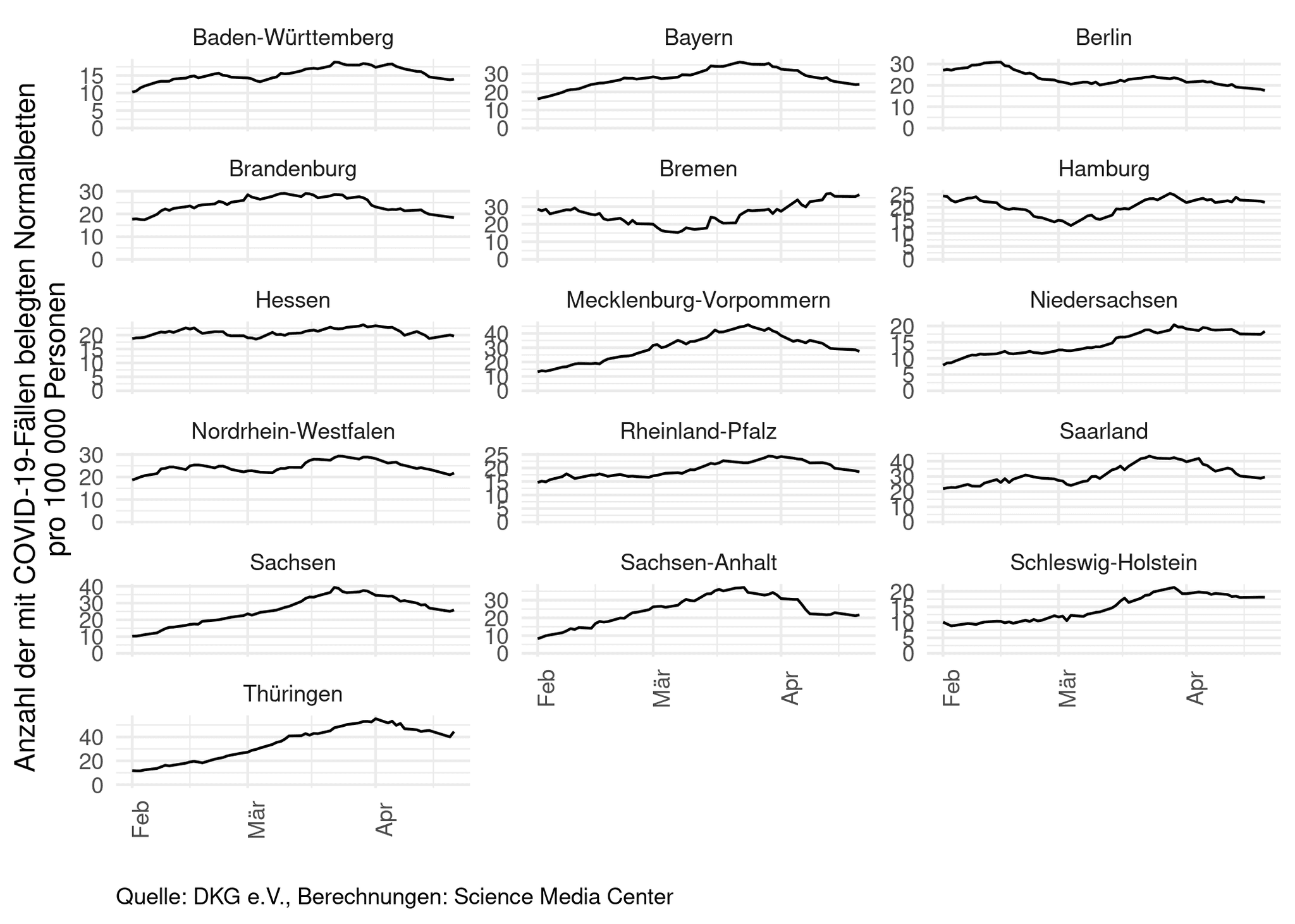In fast allen Bundesländern sinkt die Zahl der durch COVID-19-Fälle belegten Betten. Bremen und Hamburg schwanken aufgrund der kleinen Fallzahlen stärker als die einwohnerstarken Bundesländer.