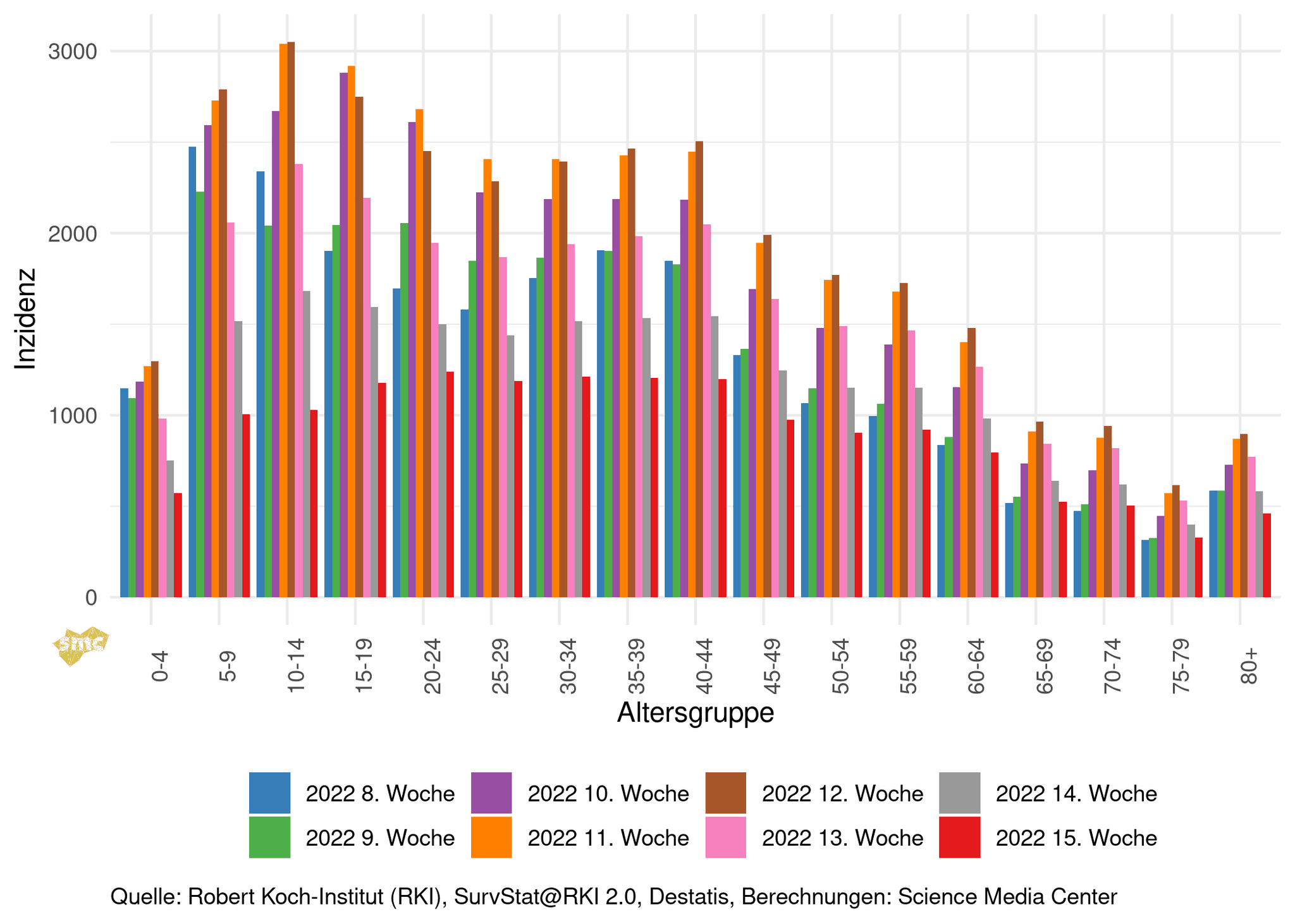 Die Grafik zeigt die Inzidenzen in den Altersgruppen nach Kalenderwoche.
