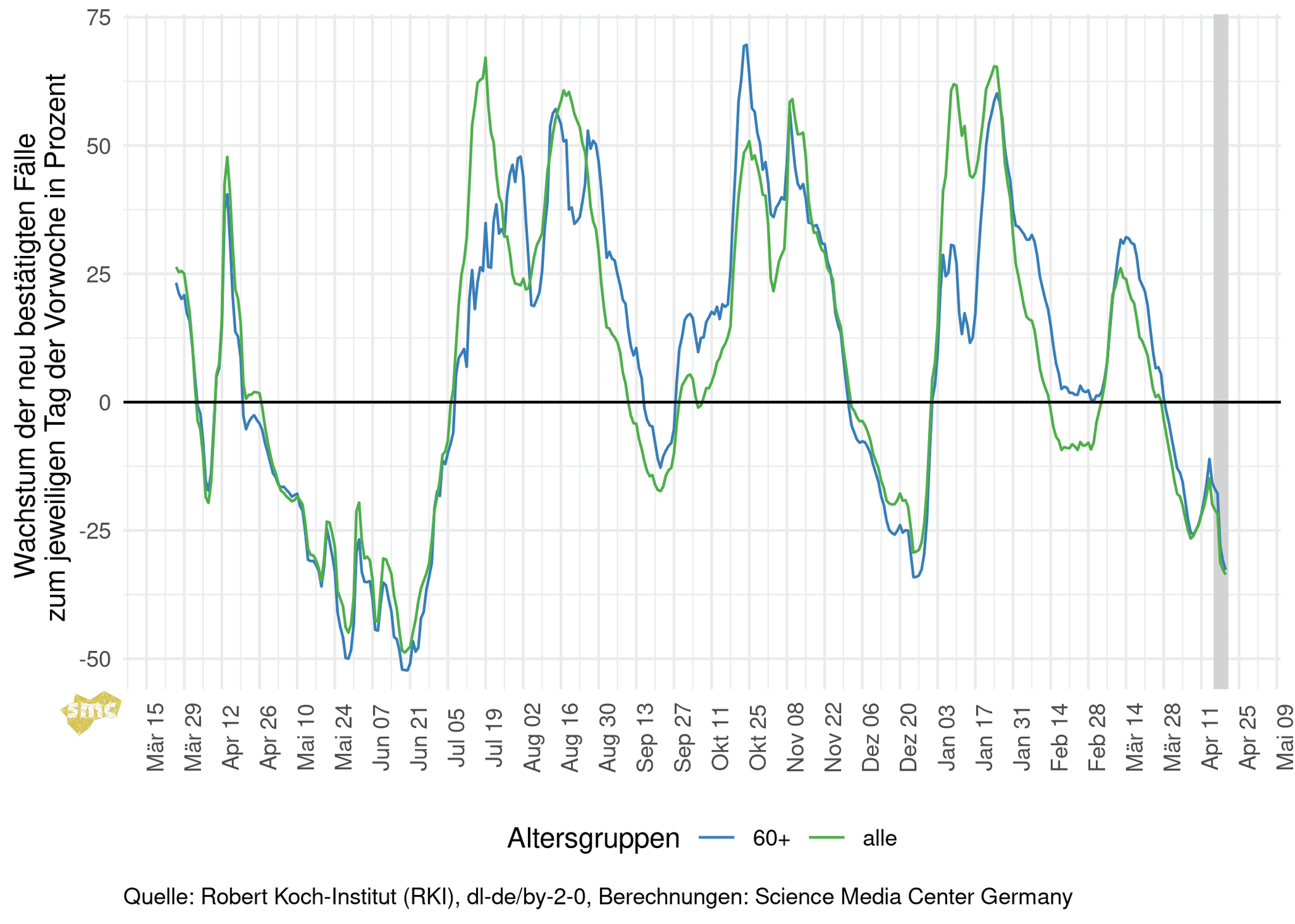 Die Grafik zeigt für jeden Tag das prozentuale Wachstum der geglätteten Fallzahlen im Vergleich zur Vorwoche. Dabei werden einmal alle gemeldeten Fälle berücksichtigt und einmal nur Fälle mit einem Alter von mindestens 60 Jahren. Beim Wachstum ist der Knick nach unten durch die Feiertage deutlich zu sehen. Ob sich die Verlangsamung des Rückgangs fortgesetzt hat, sehen wir erst Ende nächster oder Anfang übernächster Woche.