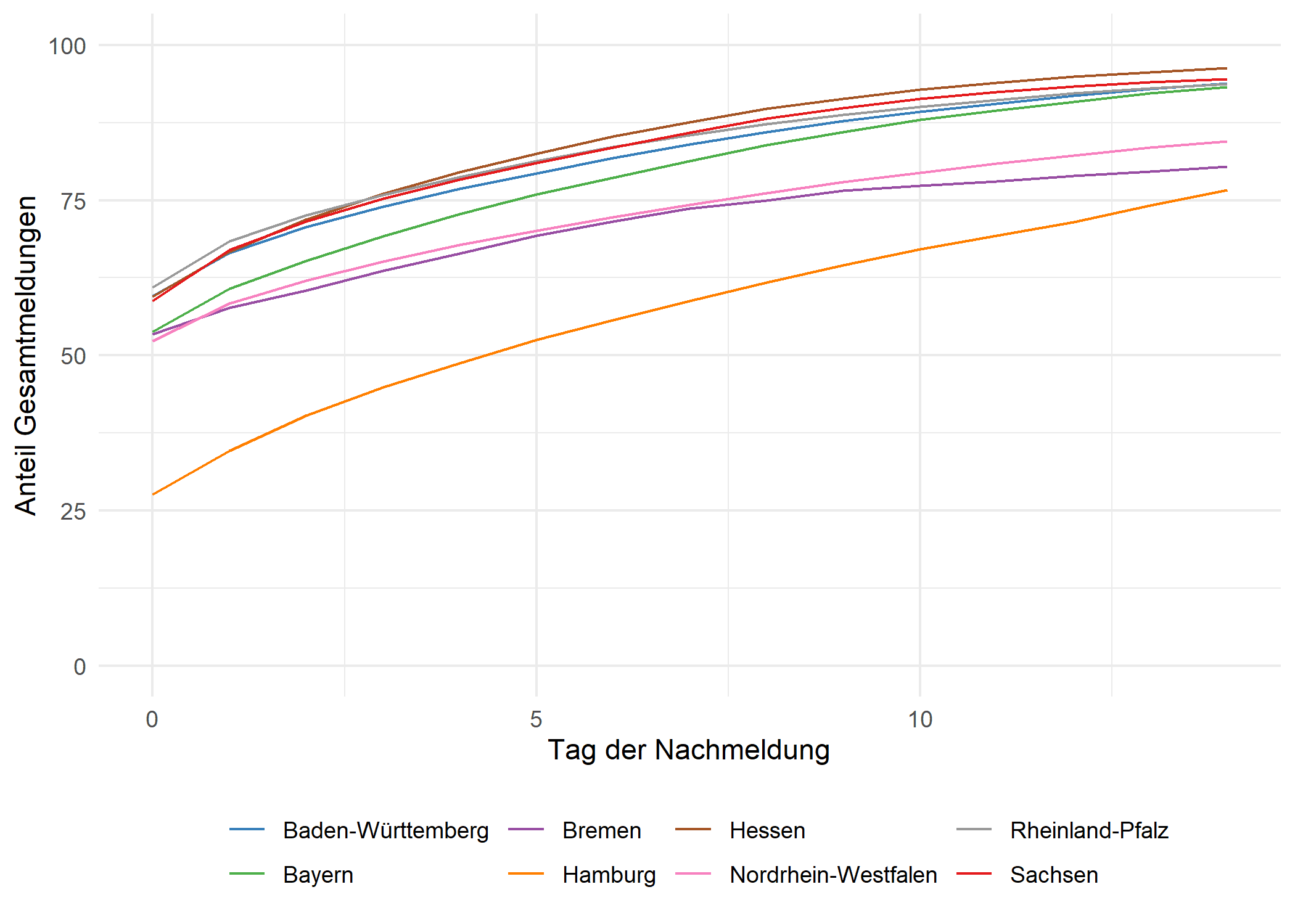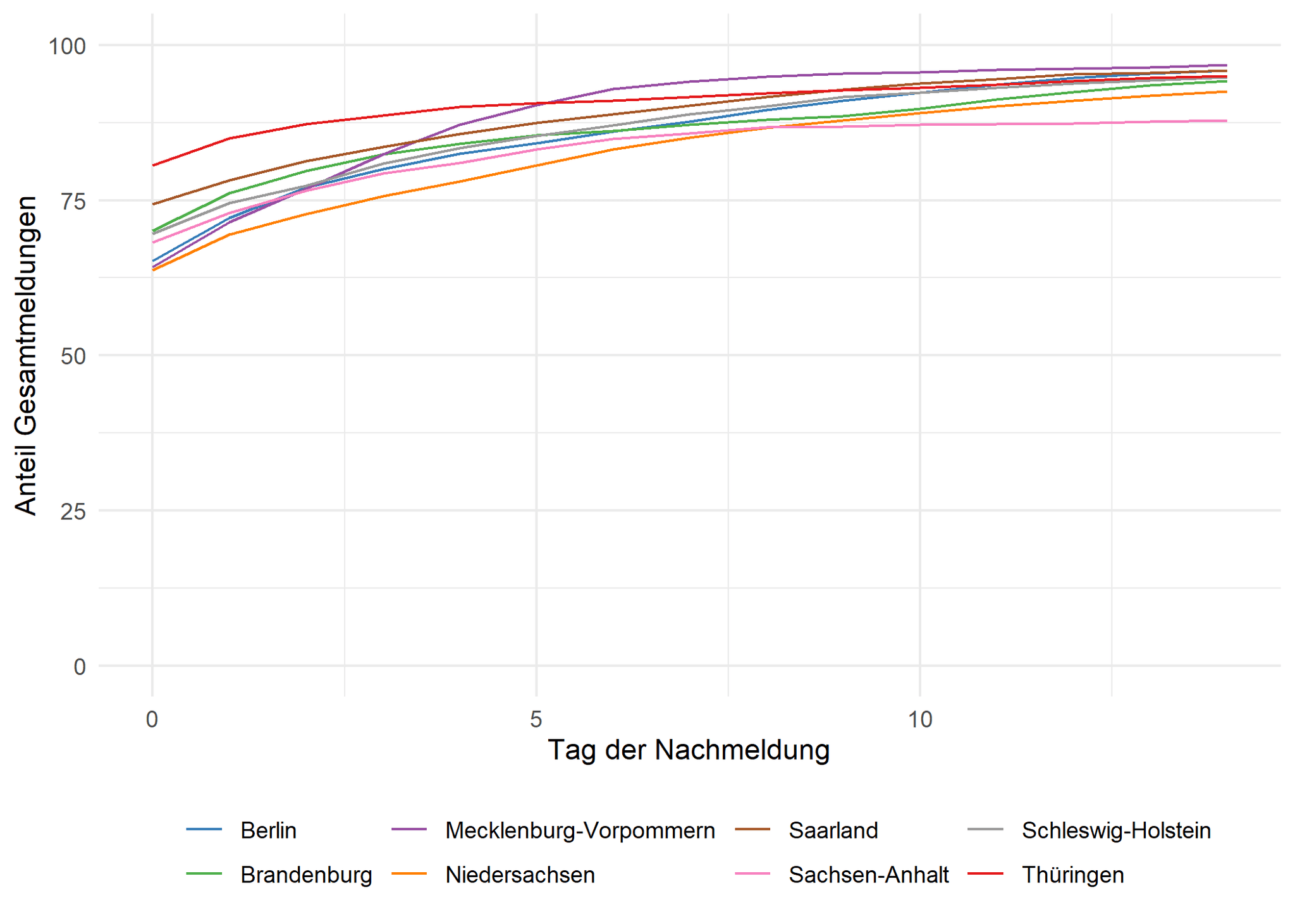 Für die Bestimmung der Überschreitung von Grenzwerten sind die korrigierten Werte aktuell nicht relevant, die endgültige Hospitalisierungsinzidenz für ein Meldedatum wird in den Bundesländern allerdings unterchiedlich schnell erreicht. Das RKI empfiehlt erst die Werte als vollständig zu betrachten, die mindestens 14 Tage in der Vergangenheit liegen. Die untenstehenden Grafiken zeigen, dass nach 14 Tagen in vielen Bundesländern in der Regel ein Großteil der Nachmeldungen eingetroffen ist. In der Zeit dazwischen sind die Bundesländer aber unterschiedlich schnell. Thüringen meldet direkt einen hohen Anteil der Hospitalisierungen, Mecklenburg-Vorpommern startet mit einem niedrigeren Anteil, hat aber nach einer Woche im Mittel die vollständigsten Daten. In Hamburg sind auch nach 14 Tagen nur etwa 75 Prozent der Fälle gemeldet worden.