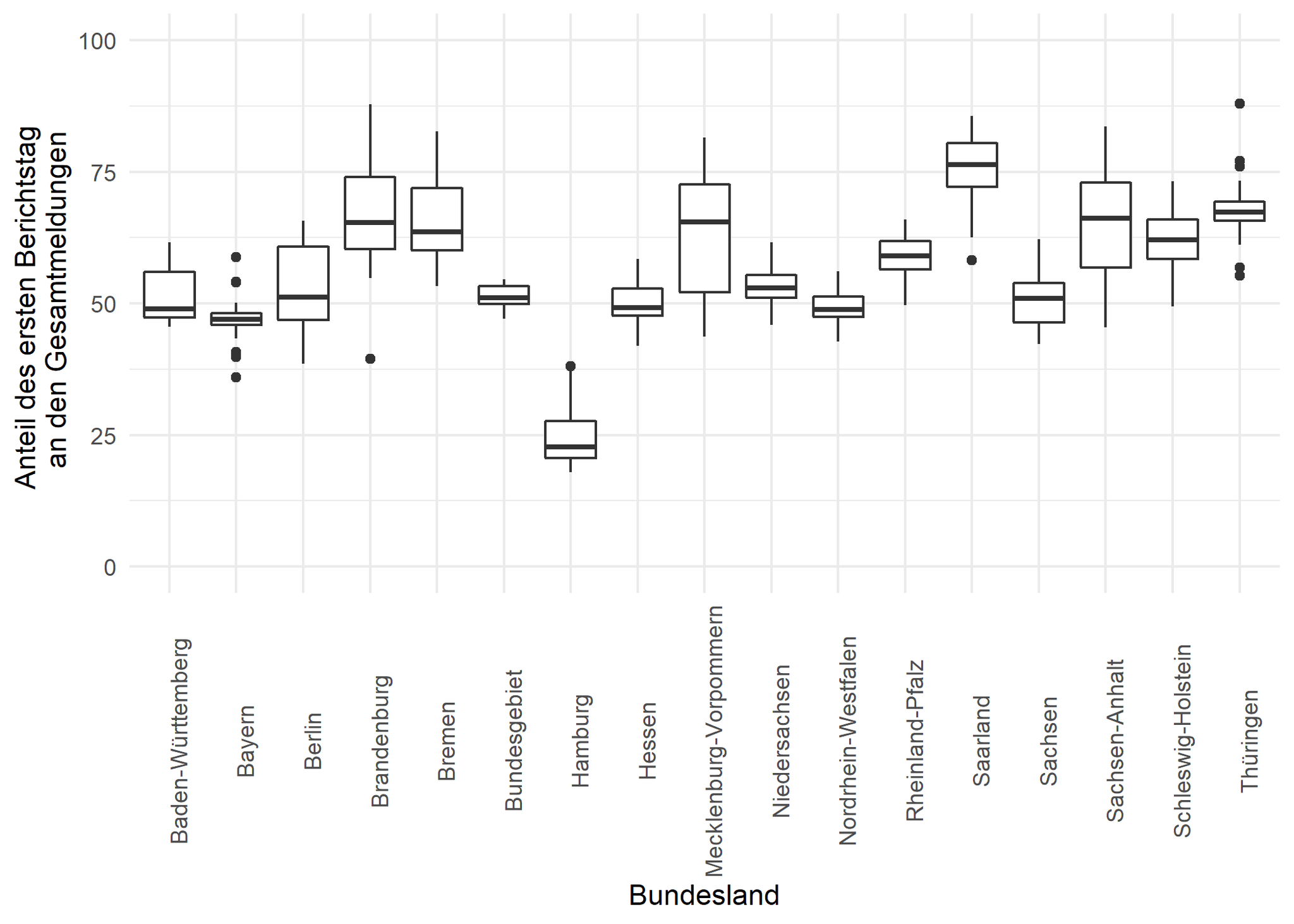 Die verwendeten Boxplots zeigen mit der Box an, in welchem Bereich die mittleren 50 Prozent der Daten liegen. Die äußeren 50 Prozent (jeweils die untersten und obersten 25 Prozent) liegen größtenteils im Bereich der an die Box angeschlossenen Linien, nur wenige Ausreißer werden einzeln als Punkte gekennzeichnet. In die Analyse sind alle Meldedaten ab dem 15. August eingeflossen, die mindestens 14 Tage in der Vergangenheit liegen. Die Box wird durch den Median geteilt.