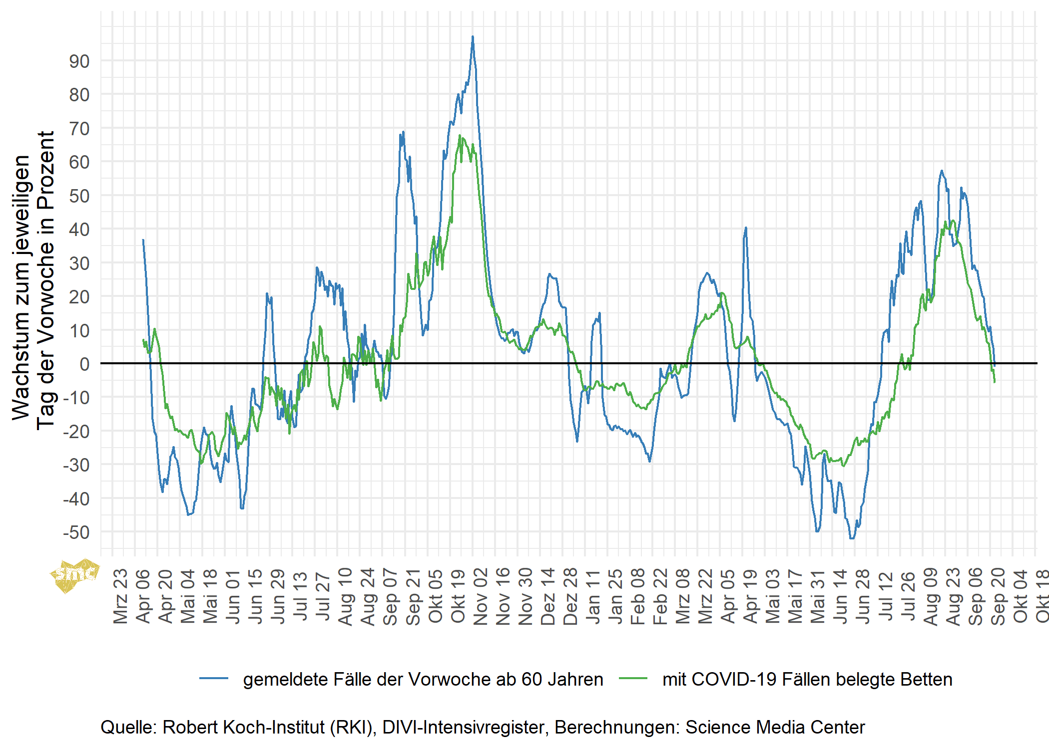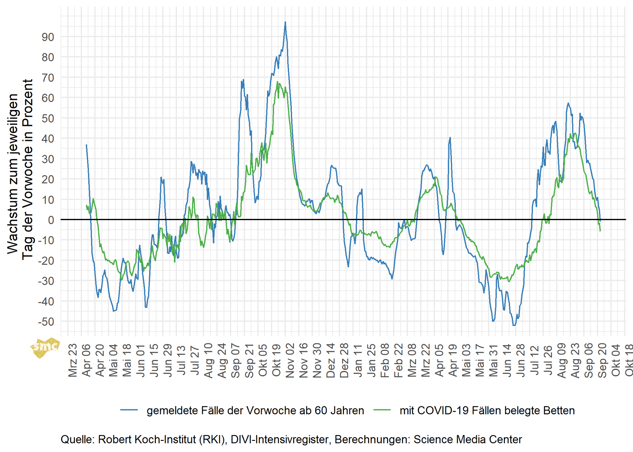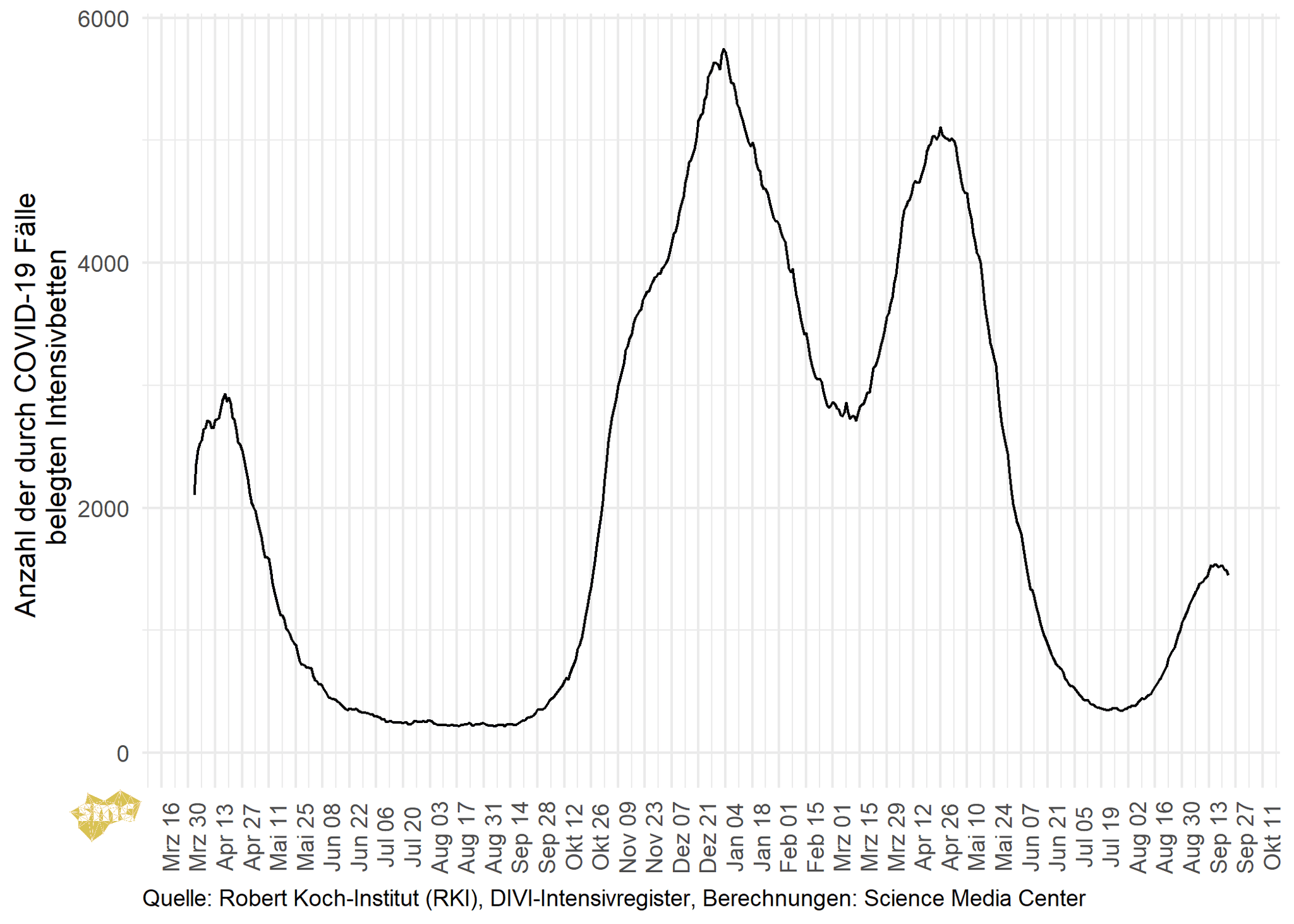 Auf den Intensivstationen sinkt die Zahl der durch COVID-19-Fälle belegte Betten inzwischen wieder. Durch den Rückgang der Inzidenzen insbesondere in den oberen Altersgruppen ist ein weiterer Rückgang zu erwarten. Dadurch nähert sich die aktuelle Situation der des Vorjahres an. Während in diesem Spätsommer die Zahlen früher stiegen und so bereits einen Monat früher vergleichbare Intensivbettenbelegungen verursachten, wird dieser Vorsprung in den nächsten Tagen kleiner werden. Dies lässt aber noch keine Prognose auf die Entwicklung im Herbst und Winter zu.