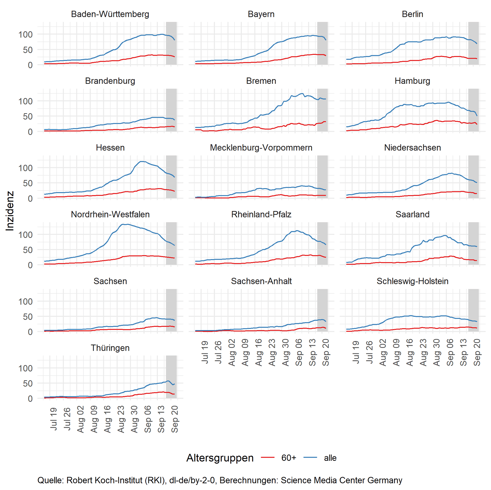 Die Inzidenz in fast allen Altersgruppen sinkt. Nur in der Altersgruppe ab 80 Jahren gibt es noch keinen Rückgang, das Wachstum ist aber gestoppt.