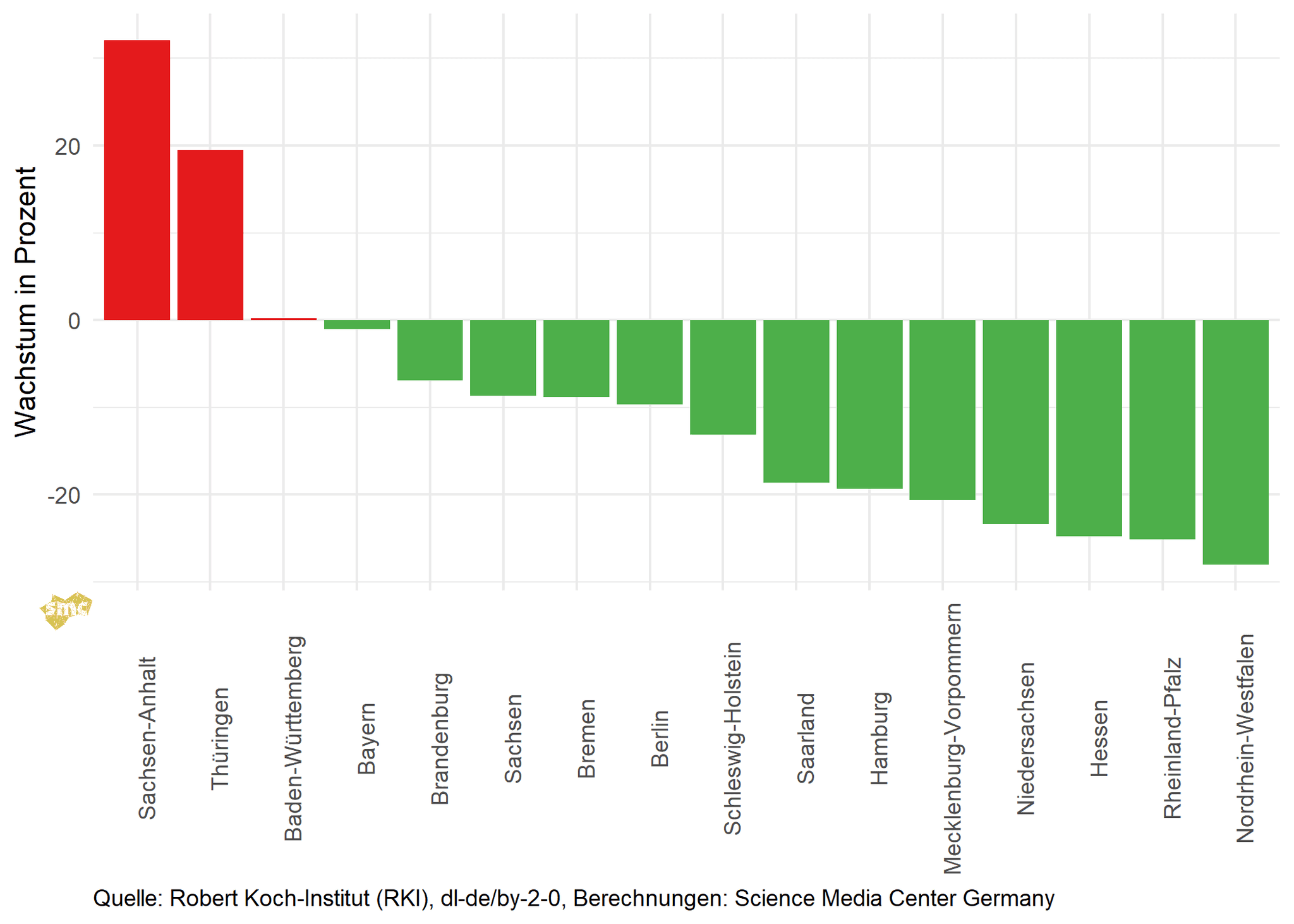 Im Folgenden wird das Wachstum der Inzidenz vom 18.09.2021 im Vergleich zur Vorwoche betrachtet. In fast allen Bundesländern sinken die Inzidenzen.