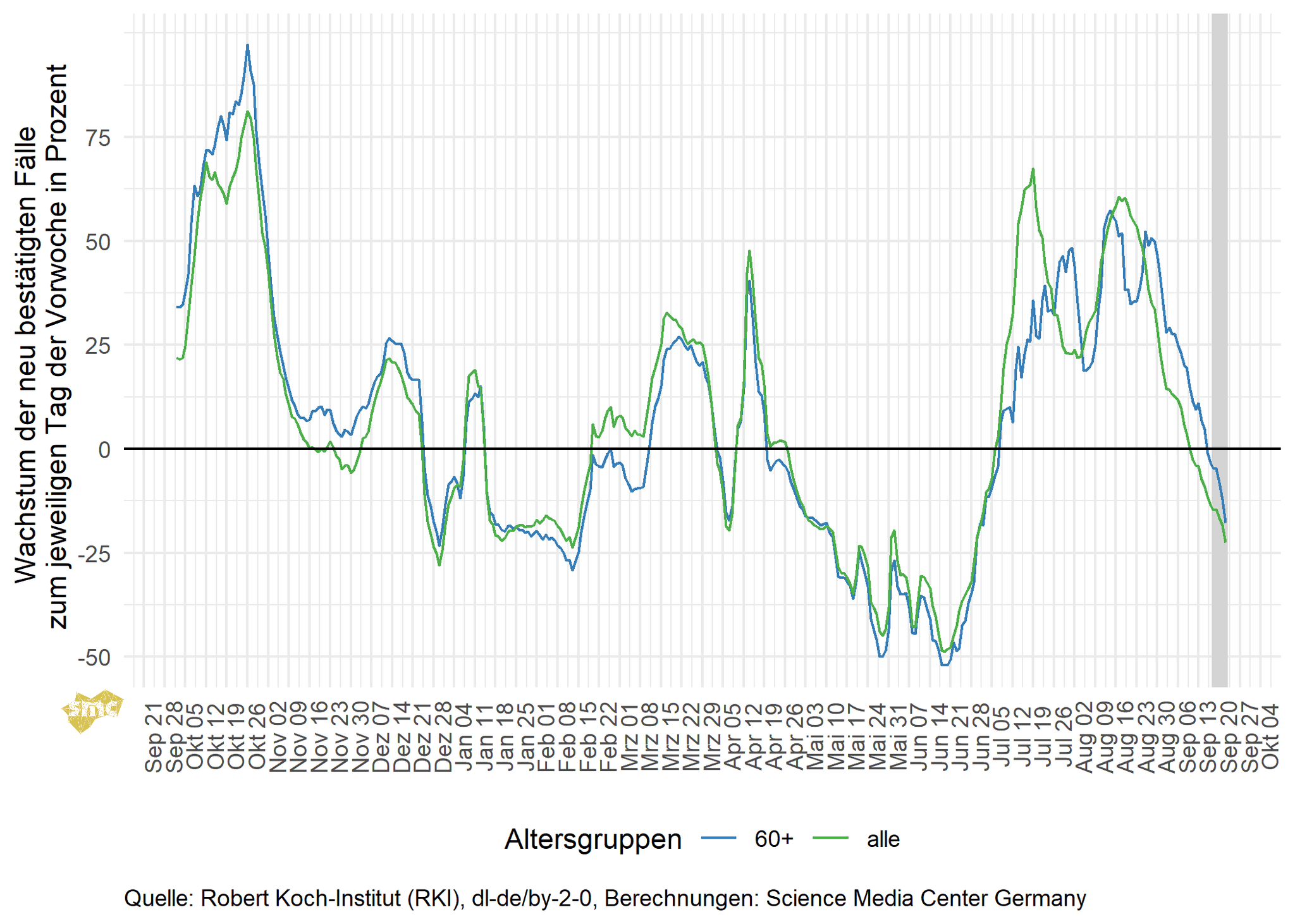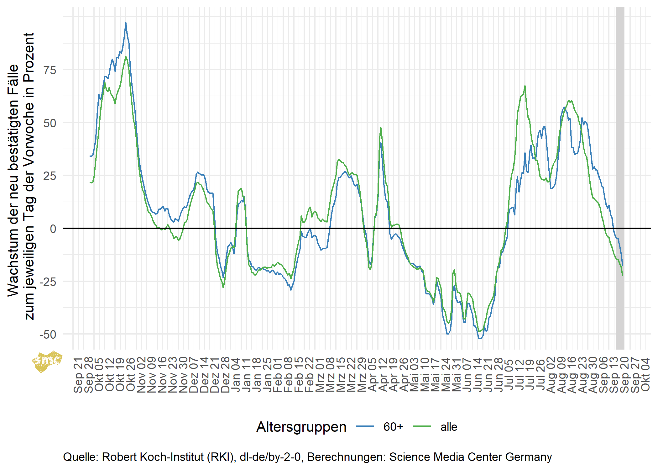 Die Grafik zeigt für jeden Tag das prozentuale Wachstum der geglätteten Fallzahlen im Vergleich zur Vorwoche. Dabei werden einmal alle gemeldeten Fälle berücksichtigt und einmal nur Fälle mit einem Alter von mindestens 60 Jahren. Das wöchentliche Wachstum ist deutlich negativ.