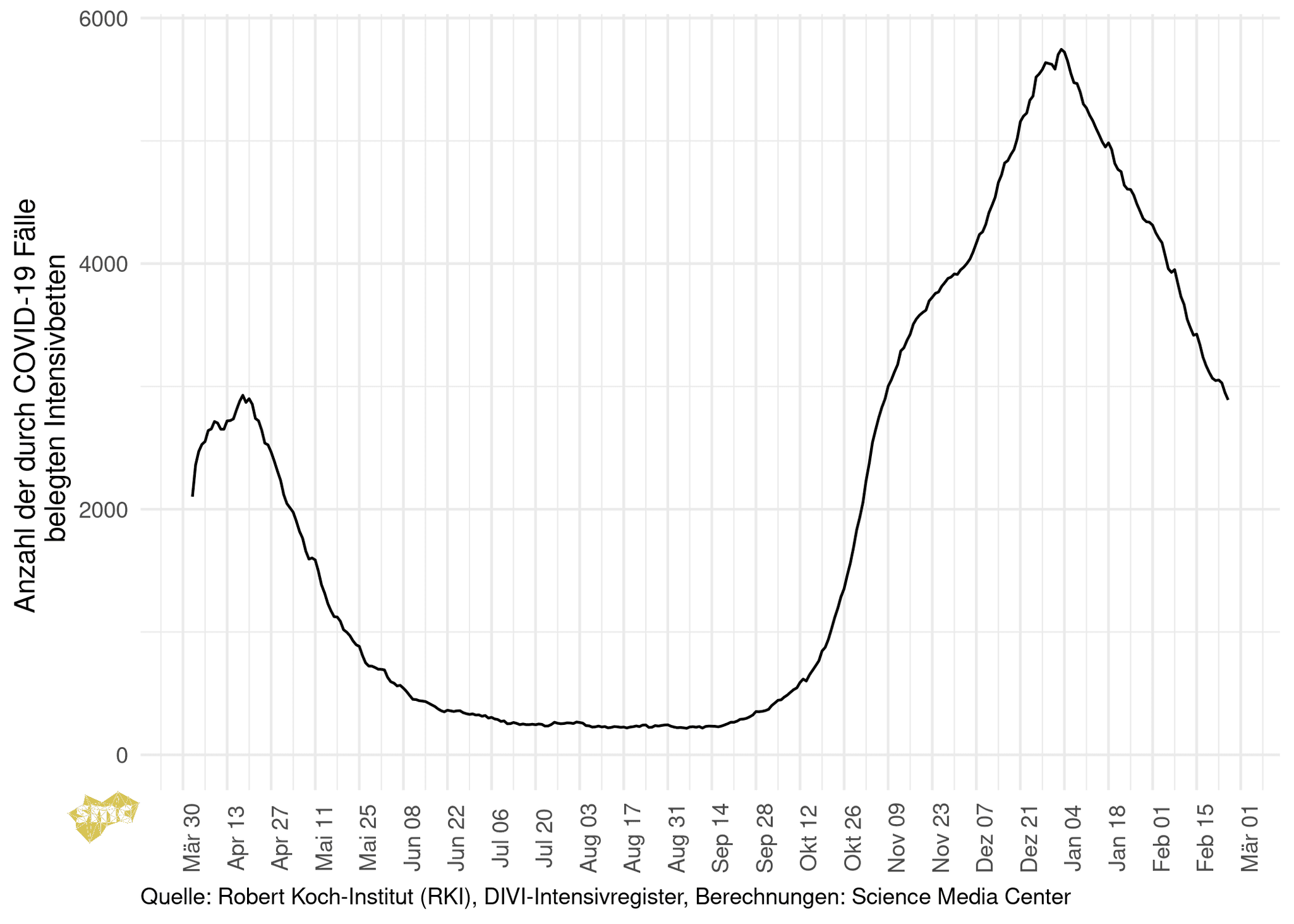 Die Zahl der COVID-19-Fälle auf den Intensivstationen sinkt. Im Vergleich zum Maximum Anfang Januar hat sich der Wert fast halbiert.