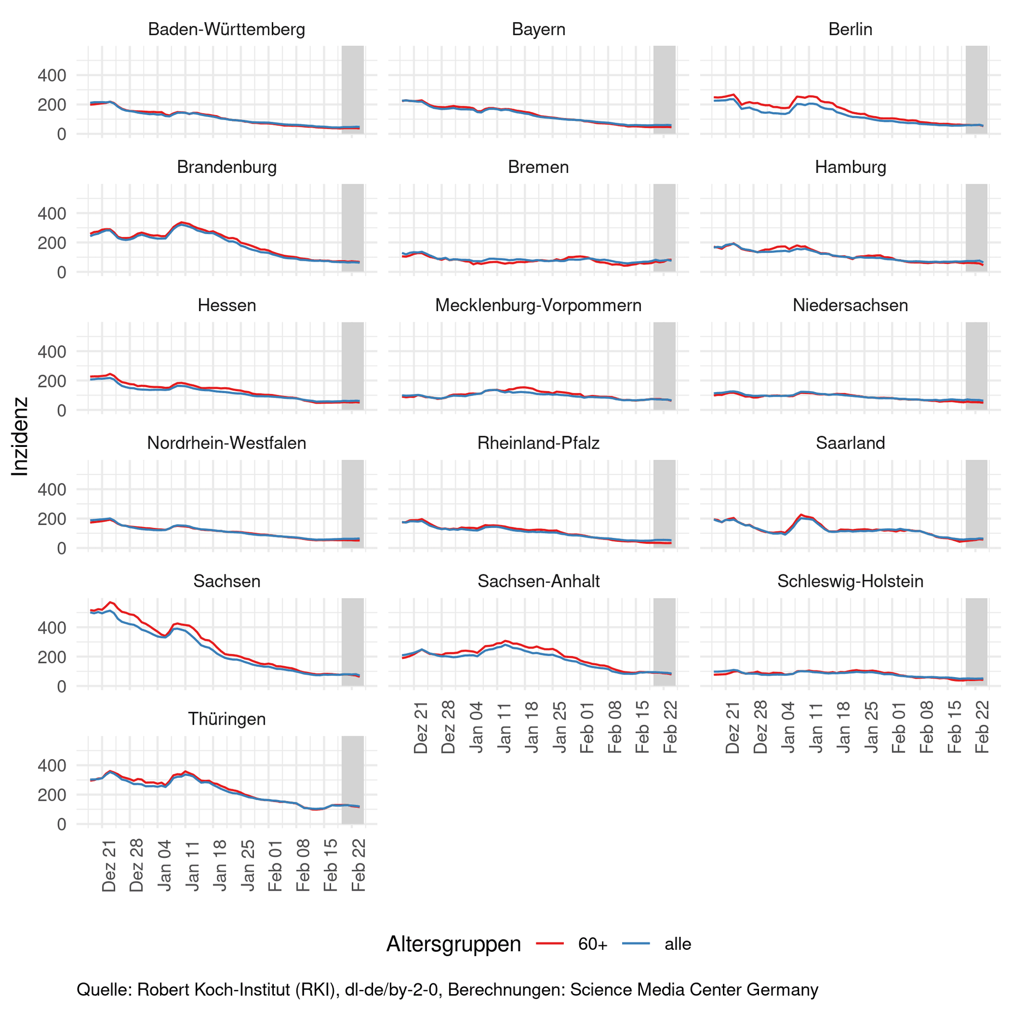 Die Inzidenzen steigen in allen Altersgruppen. Nur in der Altersgruppe ab 80 Jahren sinken die Fallzahlen weiter. Der Anstieg zur ersten Kalenderwoche ist den Problemen zum Jahreswechsel zuzuschreiben. Umgekehrt fällt die Woche davor zu niedrig aus.
