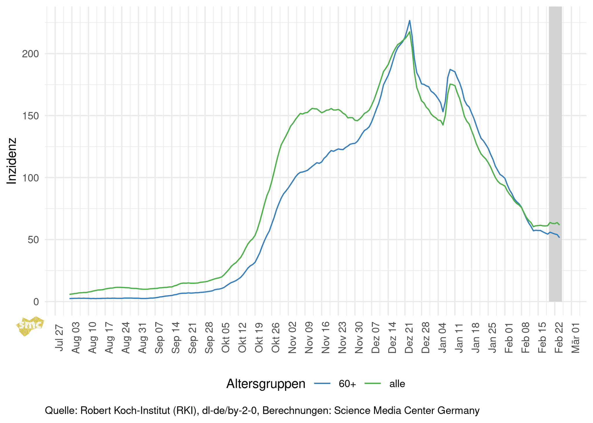 Die Grafik zeigt die Inzidenzen einmal für alle Altersgruppen und einmal ab 60 Jahren. Die Inzidenz steigt zum ersten Mal seit der Normalisierung der Meldezahlen nach Neujahr wieder. Die Inzidenz in den oberen Altersgruppen liegt weiterhin unterhalb der Gesamtinzidenz.