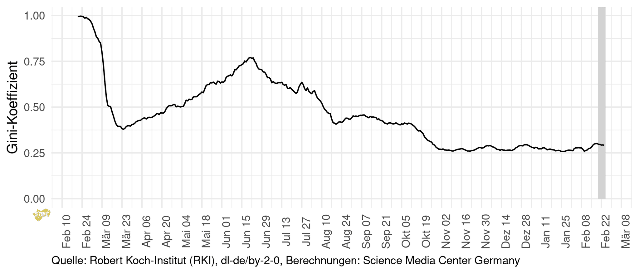 Ende Februar war die Ungleichheit bei den gemeldeten Fällen noch sehr groß, fiel dann aber mit steigender Fallzahl ab, da sich das Virus über Deutschland verteilte. Auch in den Hochzeiten waren die gemeldeten Inzidenzen nicht gleichmäßig verteilt.