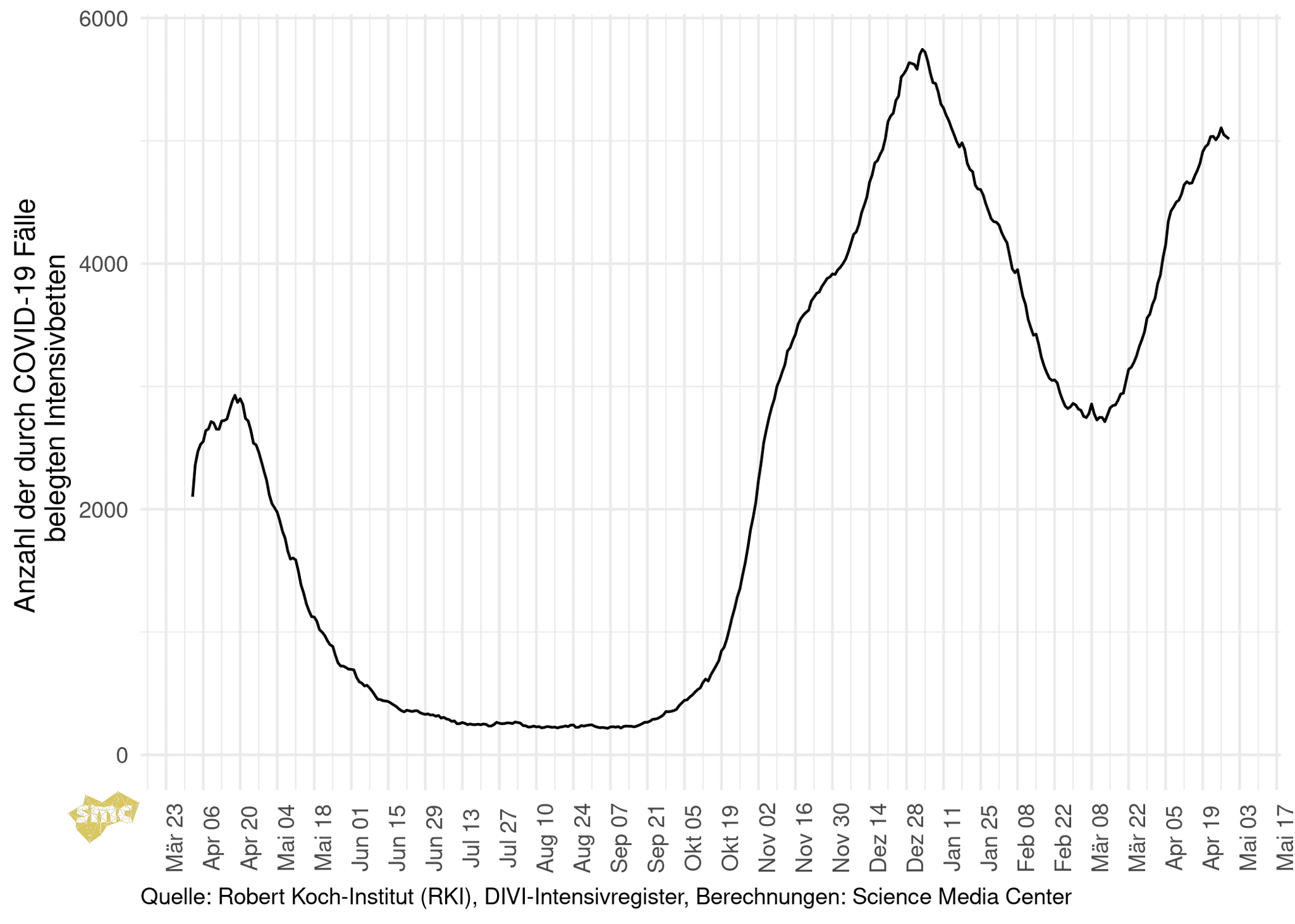Auf den Intensivstationen ist aktuell kein Wachstum der Zahl der durch COVID-19-Fälle belegte Betten zu beobachten. Da sich diese Bettenzahl noch auf hohem Niveau befindet, kann erst nach einem deutlichen Rückgang von einer Entspannung gesprochen werden.