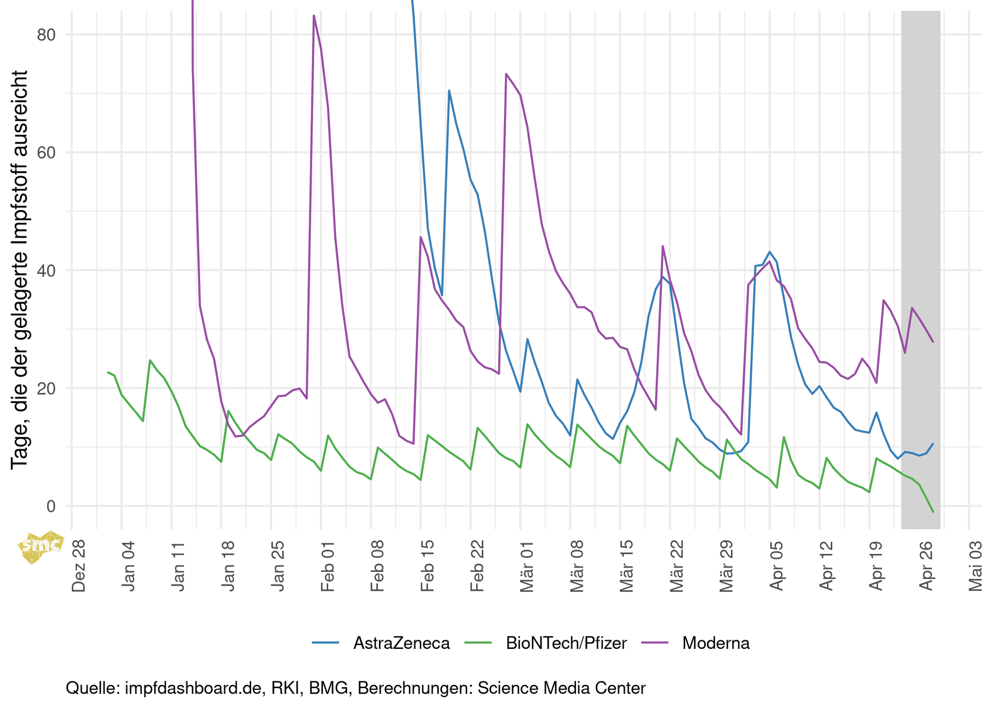 Da sowohl die Zahl der täglich verimpften Dosen als auch die Größe der Impfstofflieferungen wächst, darf bei der Frage, ob zu viel Impfstoff gelagert wird, nicht nur auf die absoluten Zahlen geachtet werden. In der folgenden Grafik wird der noch nicht verimpfte Impfstoff mit den der aktuellen über sieben Tage geglätteten Impfgeschwindigkeit verglichen. Die Grafik gibt also an, wie viele Tage der gelagerte Impfstoff ohne Nachschub ausreichen würde.