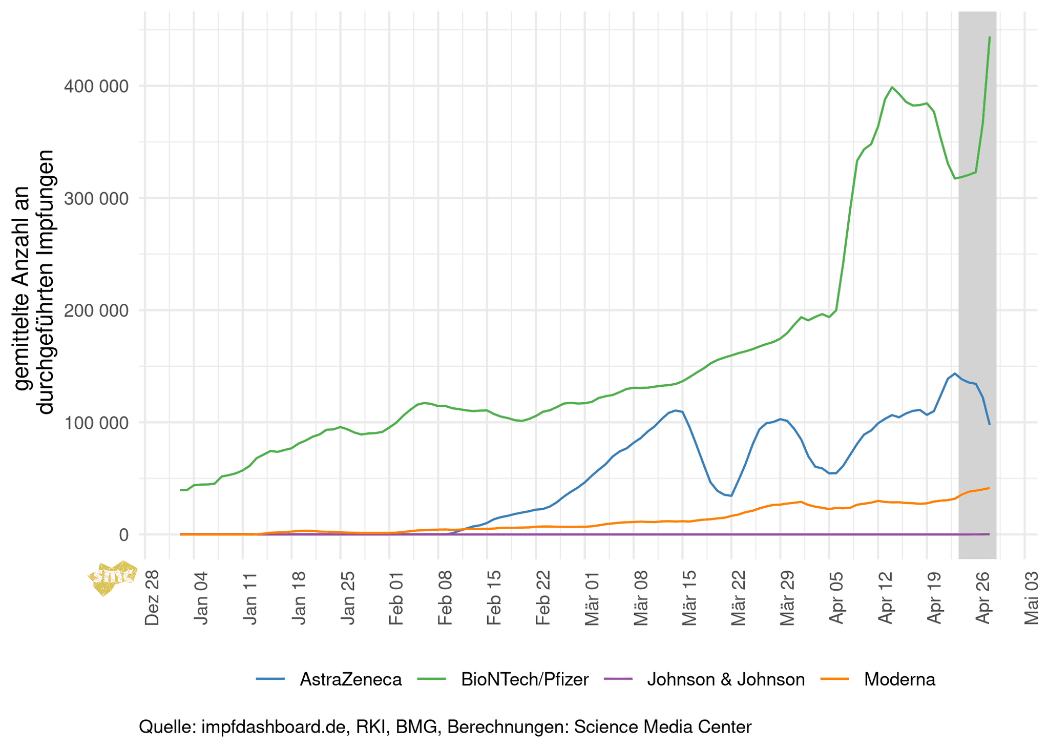 Da immer mehr Impfstoff verfügbar ist, kann sich auch das Impftempo beschleunigen. Die Grafik zeigt den über sieben Tage geglätteten Verlauf der täglichen Impfungen insgesamt und nach Erst- beziehungsweise Zweitimpfung getrennt. Deutlich zu sehen ist das zeitlich verzögerte Wachstum der Erst- und Zweitimpfungen. Aufgrund der limitierten Menge an Impfstoff musste im Januar sogar die Zahl der Erstimpfungen reduziert werden, um genug Dosen für die Zweitimpfungen bereit halten zu können. Mit den Lieferungen dieser Woche steigt das Impftempo wieder an. Als Besonderheit wird der Johnson & Johnson Impfstoff direkt als Zweitimpfung gezählt, da hier nur eine Impfdosis nötig ist.