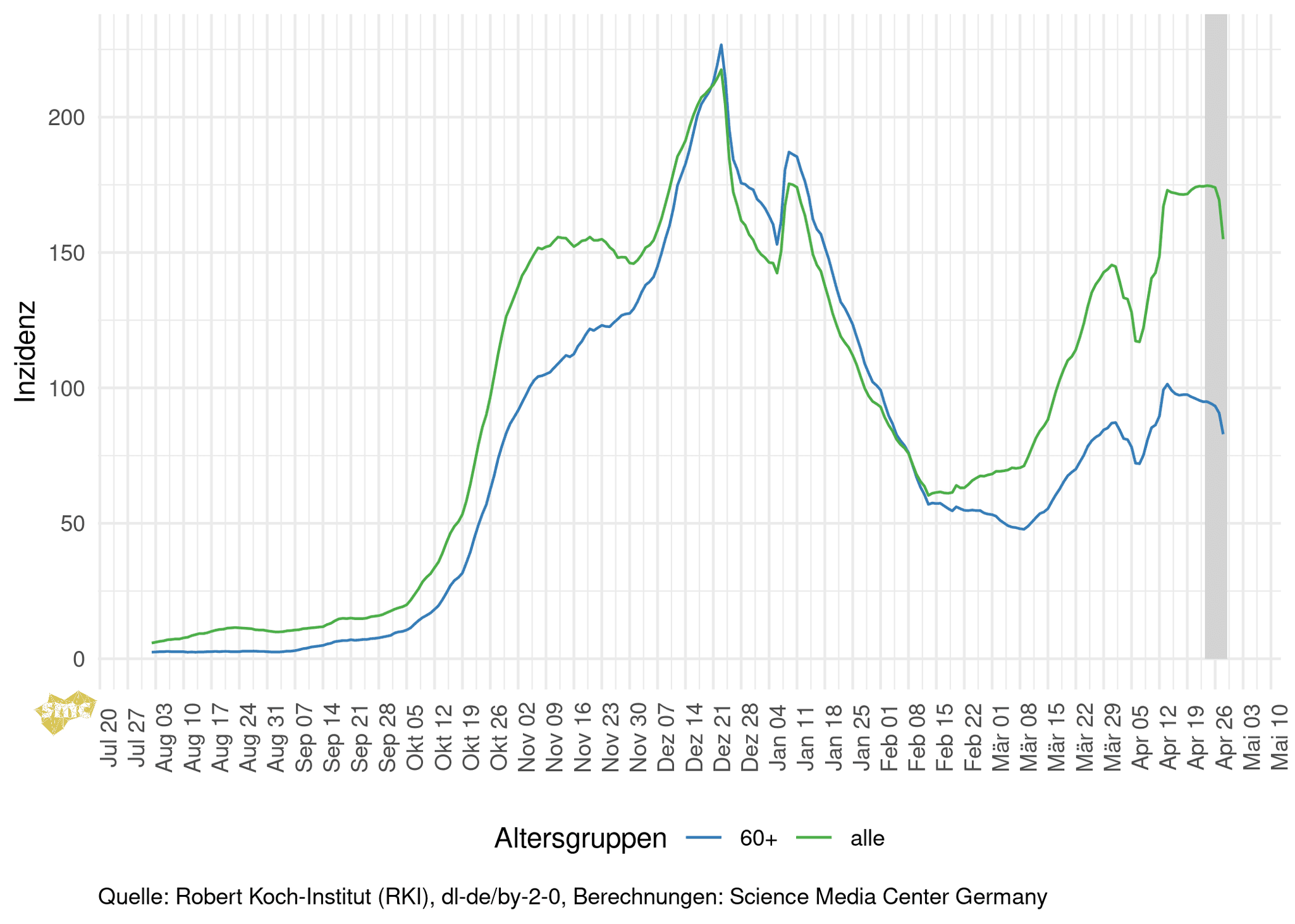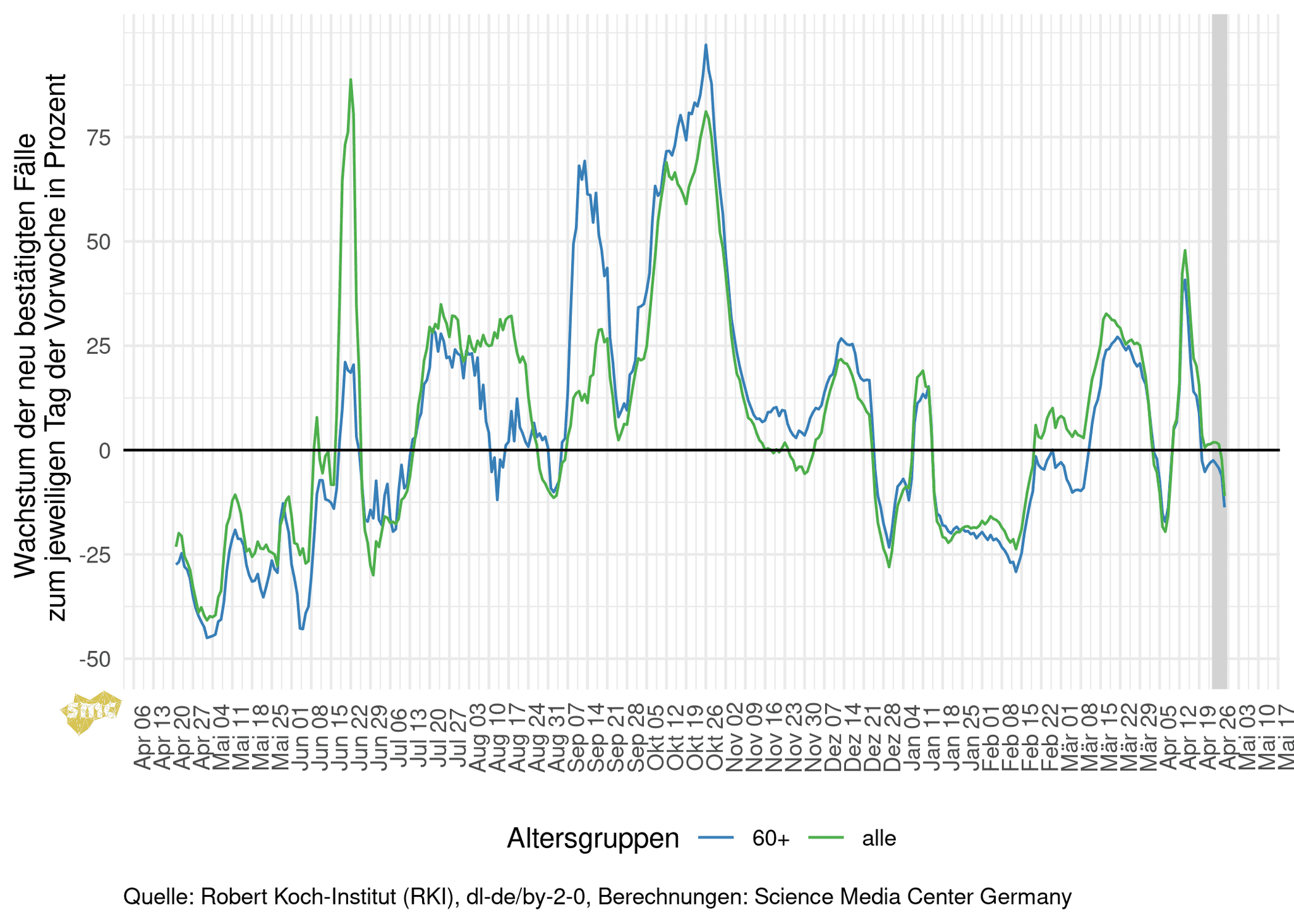Die Grafik zeigt für jeden Tag das prozentuale Wachstum der geglätteten Fallzahlen im Vergleich zur Vorwoche. Dabei werden einmal alle gemeldeten Fälle berücksichtigt und einmal nur Fälle mit einem Alter von mindestens 60 Jahren. Wie erwartet ist das Wachstum stark gesunken und liegt aktuell nahe Null. In den oberen Altersklassen ist das Wachstum leicht negativ.