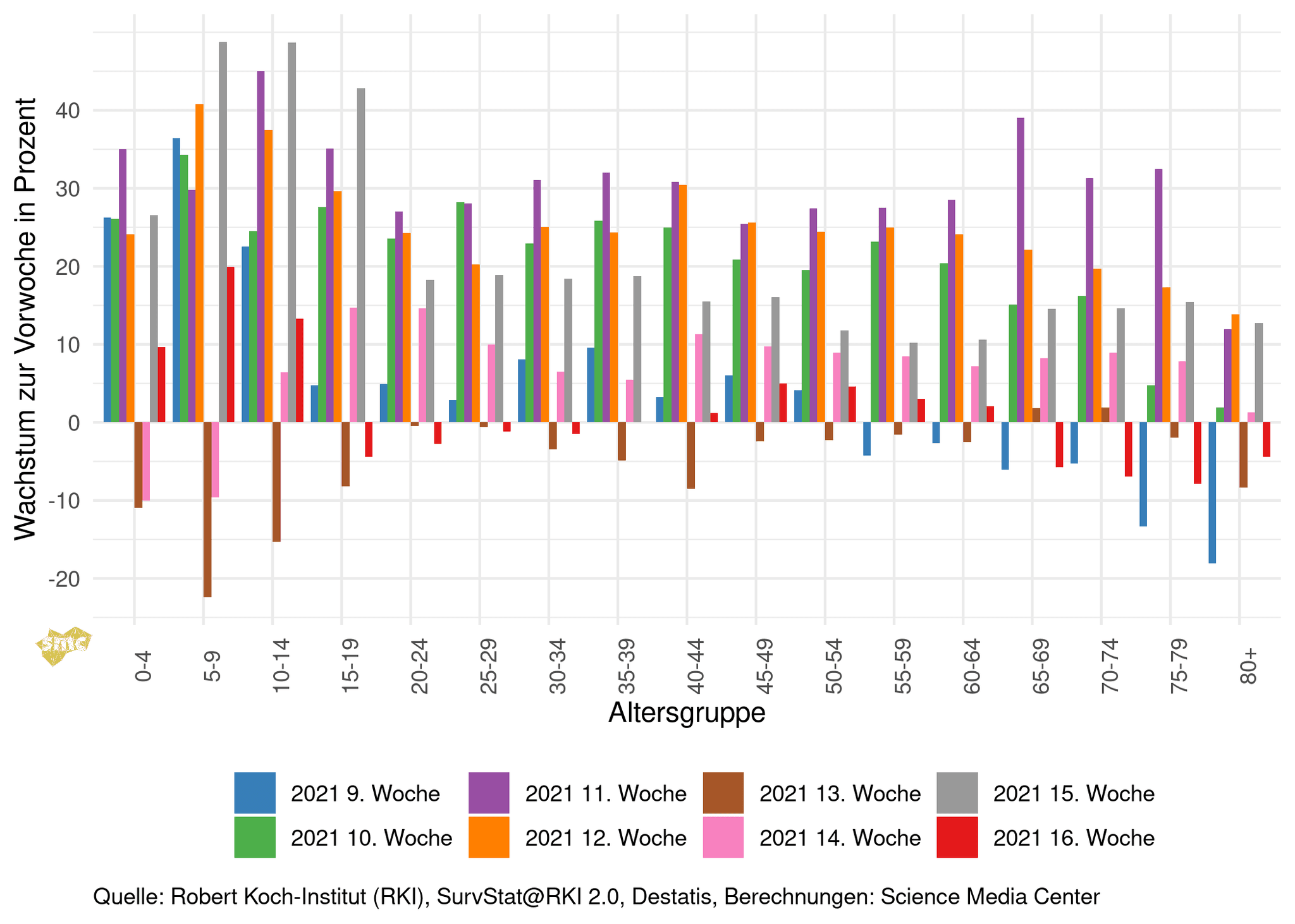 Das größte prozentuale Wachstum weisen die Altersjahrgänge unter 15 Jahren auf. Ab 65 Jahren gehen die Inzidenzen zurück. Auch im Bereich zwischen 15 und 35 gibt es leichte Rückgänge.