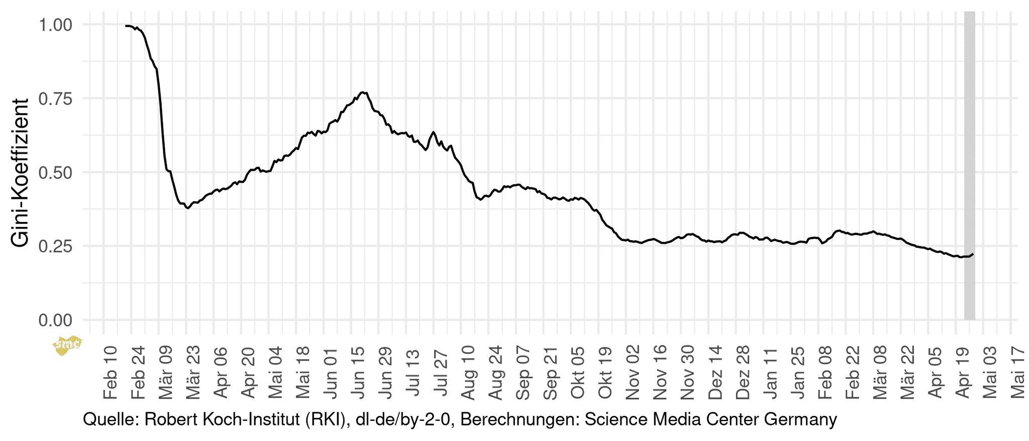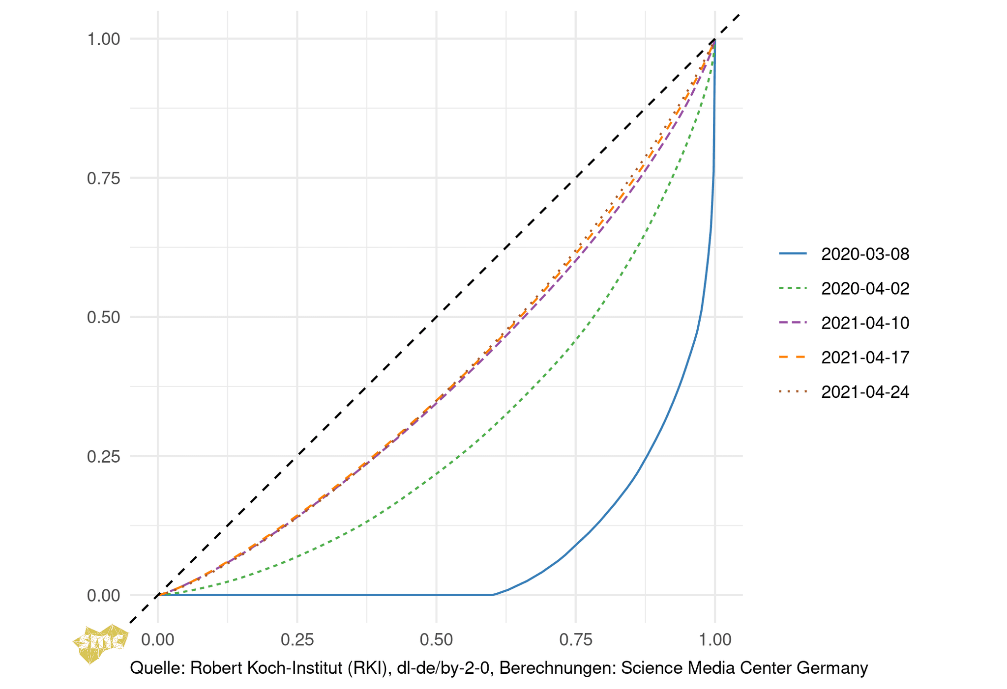 Ende Februar war die Ungleichheit bei den gemeldeten Fällen noch sehr groß, fiel dann aber mit steigender Fallzahl ab, da sich das Virus über Deutschland verteilte. Auch in den Hochzeiten waren die gemeldeten Inzidenzen nicht gleichmäßig verteilt.