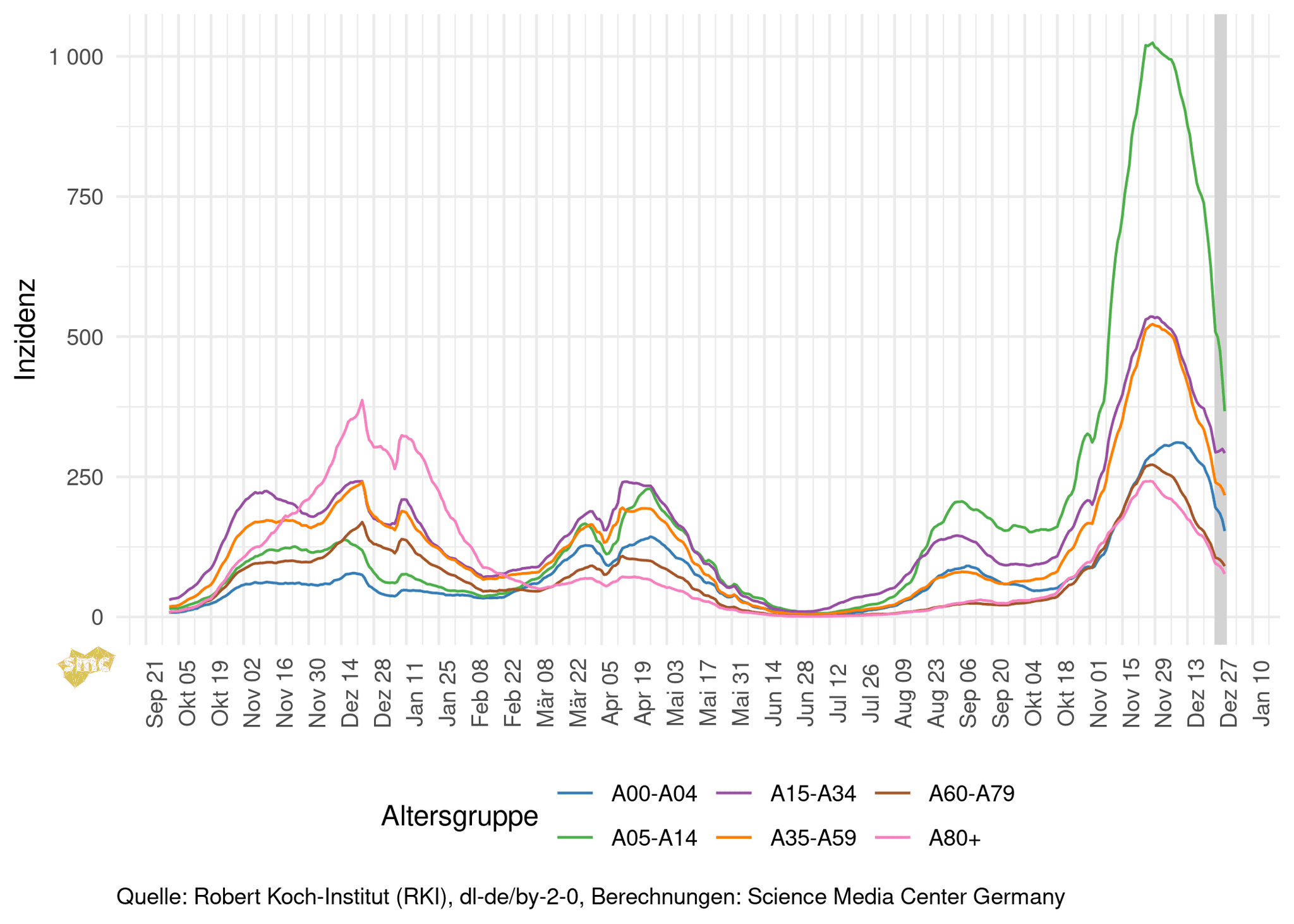 Die Inzidenz sinkt in allen Altersgruppen, ist aber durch die Feirtage stark unterschätzt.