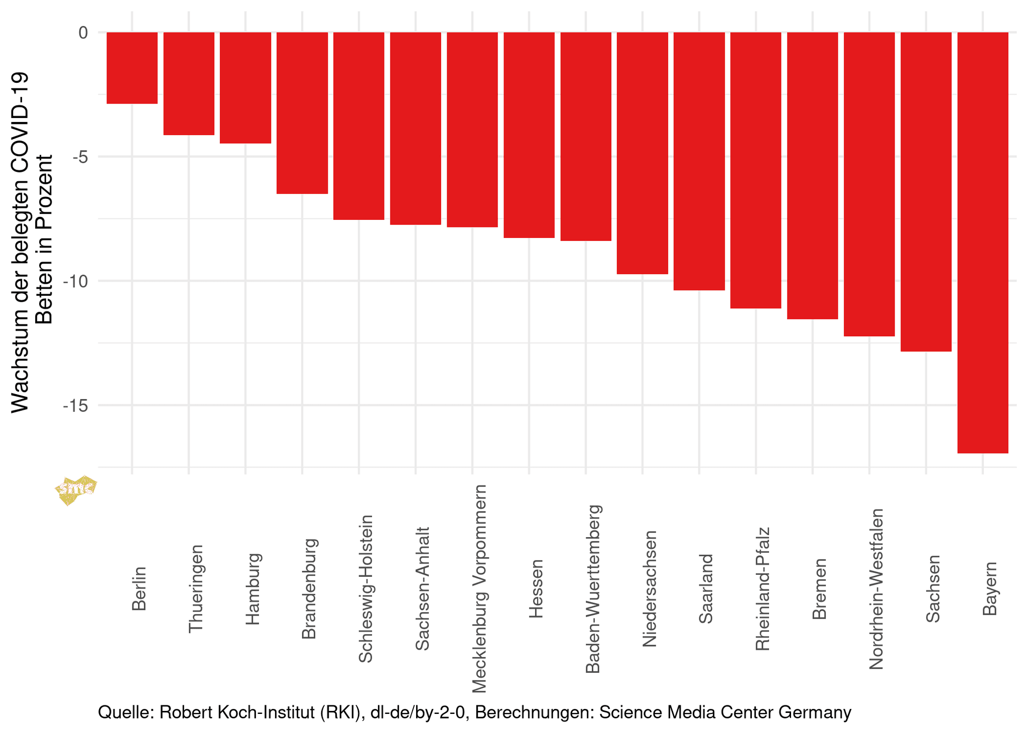 Schaut man sich nach Bundesländern an, wie die Intensivstationen ausgelastet sind, lag im vergangenen Winter das jeweilige Maximum auf einem anderen relativen Niveau. Während Berlin und Sachsen in der Spitze eine Auslastung von etwa 40 Prozent erreichten, waren in Schleswig-Holstein nicht einmal 20 Prozent der gemeldeten Intensivbetten mit COVID-19-Fällen belegt. Die relative Grenze schwankt dabei über die Zeit, da nicht an jedem Tag gleich viele verfügbare Betten gemeldet werden. Um die relative Belastung vergleichen zu können, werden auf der Y-Achse unterschiedliche absolute Skalen verwendet. In Thüringen gab es bisher wenig Rückgang, die Zahlen in den anderen Hotspots wie Bayern und Sachsen sind deutlich gesunken.