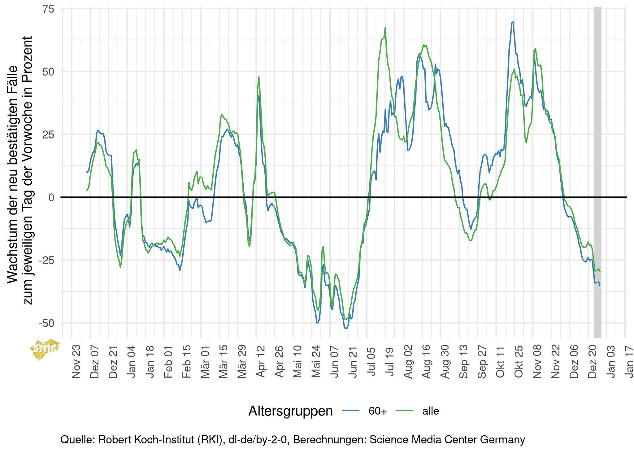 Die Grafik zeigt für jeden Tag das prozentuale Wachstum der geglätteten Fallzahlen im Vergleich zur Vorwoche. Dabei werden einmal alle gemeldeten Fälle berücksichtigt und einmal nur Fälle mit einem Alter von mindestens 60 Jahren. Das Negativwachstum ist aufgrund der Feiertage nicht interpretierbar.