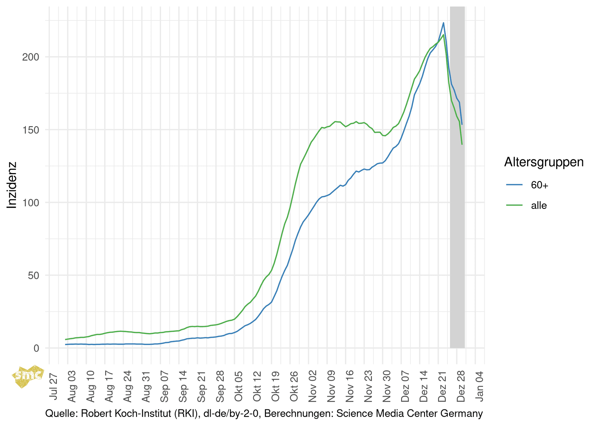 Die Grafik zeigt die Inzidenzen einmal für alle Altersgruppen und einmal ab 60 Jahren. Beide Kurven sind über die Feiertage stark gefallen, was die aktuelle Lage nicht widerspiegelt.