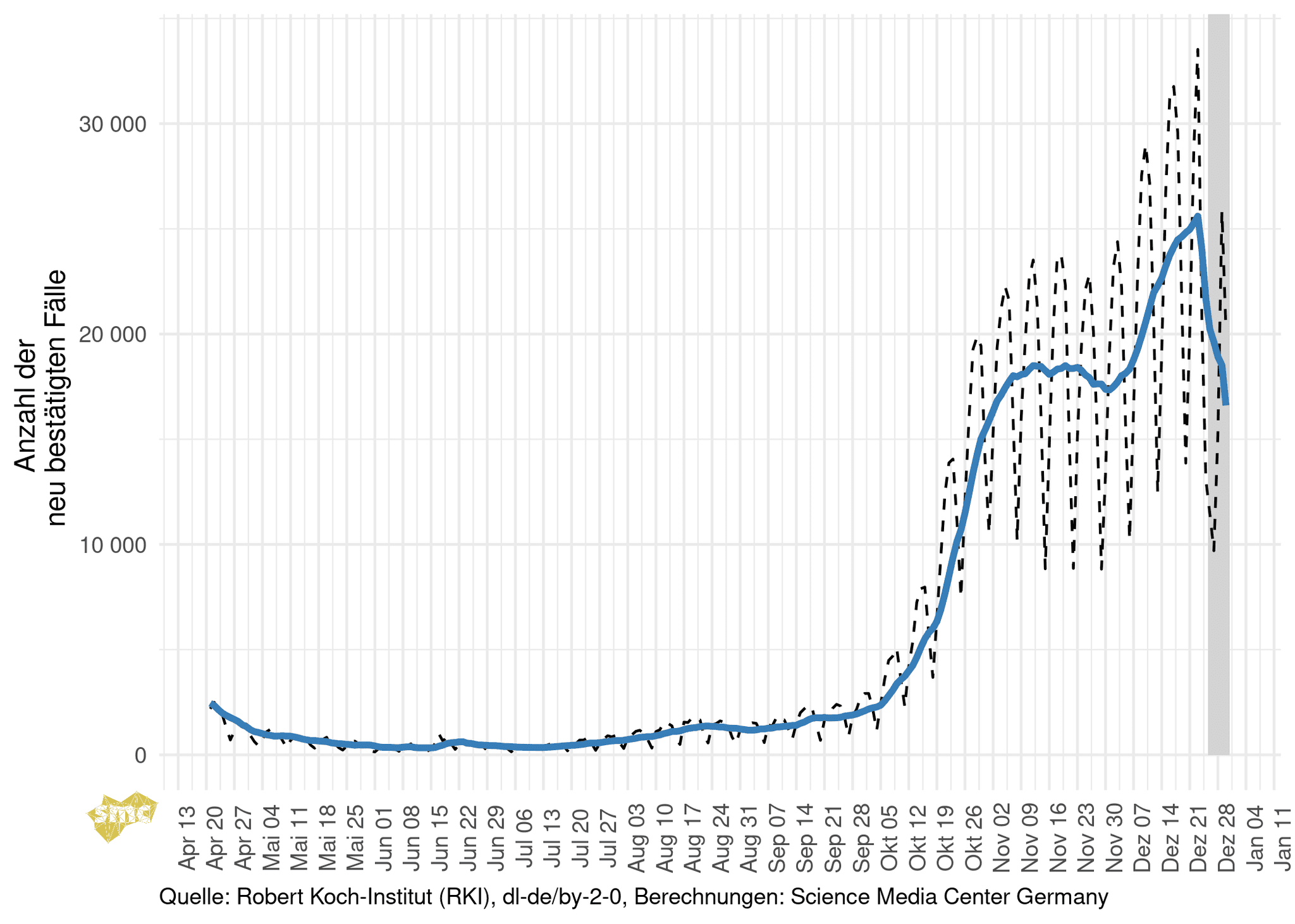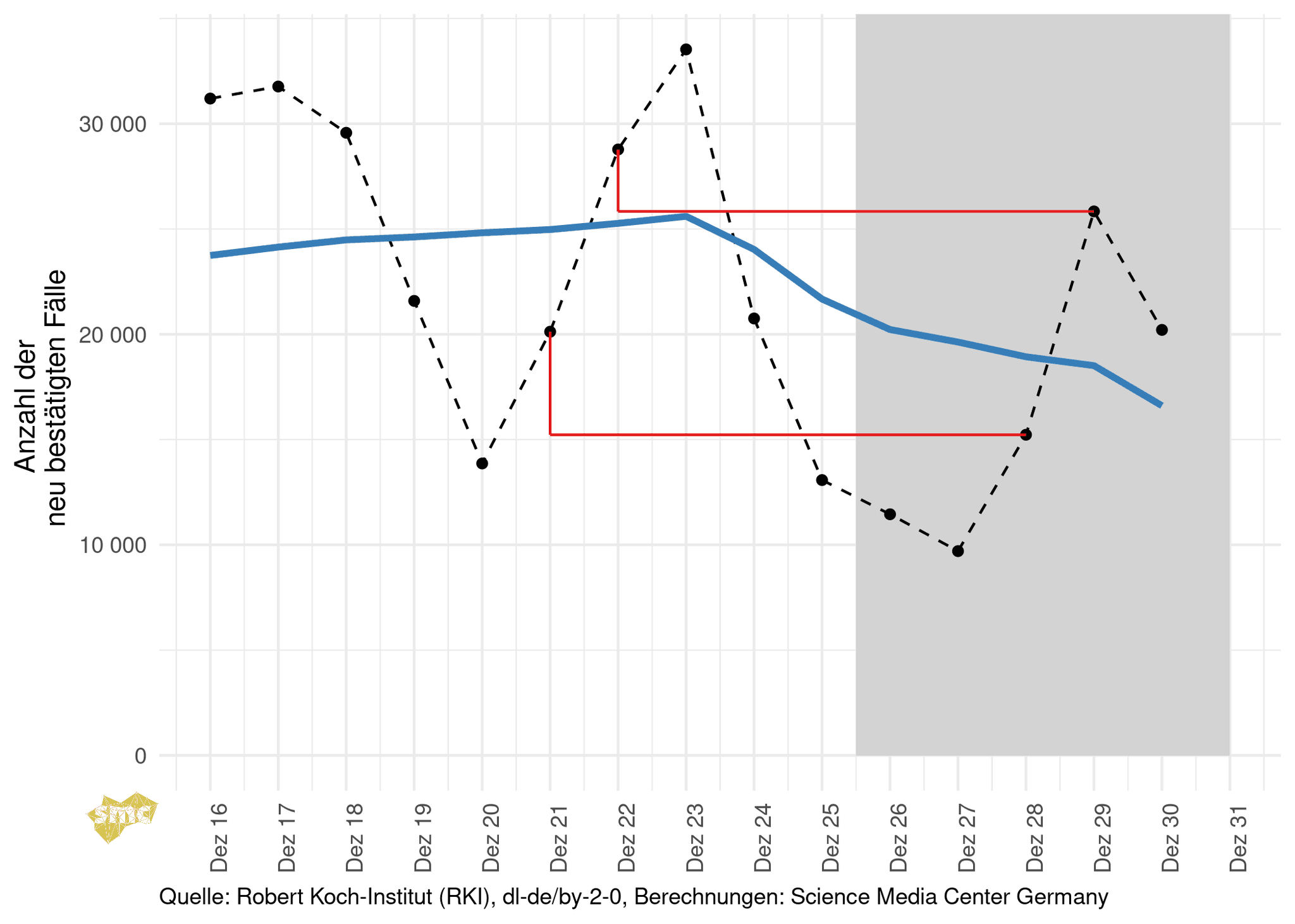Vergleicht man die Werte vom 28. und 29. Dezember mit denen der Vorwoche (rote Linien), so nähern sie sich diesen Zahlen bereits wieder deutlich an. Dabei ist zu beachten, dass in den nächsten Tagen noch Nachmeldungen für diese Daten erfolgen werden (insbesondere im grauen Bereich), was die Tageswerte weiter erhöht. Der Wert für das letzte verfügbare Datum liegt noch deutlich zu niedrig, sodass ein Vergleich noch nicht zielführend ist. Auch wenn der Verlauf nach Meldedatum etwas stabiler ist als die Zahl der täglich in die RKI-Statistik aufgenommenen Fälle, so ist auch dieser von einem Feiertagseffekt betroffen: Tests, die über die Feiertage nicht durchgeführt wurden, werden eventuell nachgeholt und führen so zu höheren Werten an Tagen nach den Feiertagen. Da mit dem Jahreswechsel weitere Feiertage anstehen, werden die Zahlen in den kommenden Tagen weiterhin schwer zu interpretieren sein.