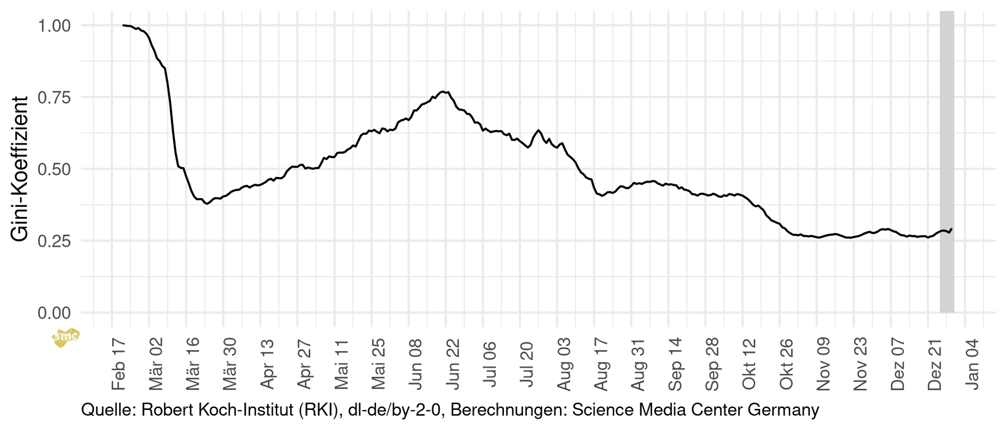 Ende Februar war die Ungleichheit bei den gemeldeten Fällen noch sehr groß, fiel dann aber mit steigender Fallzahl ab, da sich das Virus über Deutschland verteilte. Auch in den Hochzeiten waren die gemeldeten Inzidenzen nicht gleichmäßig verteilt.