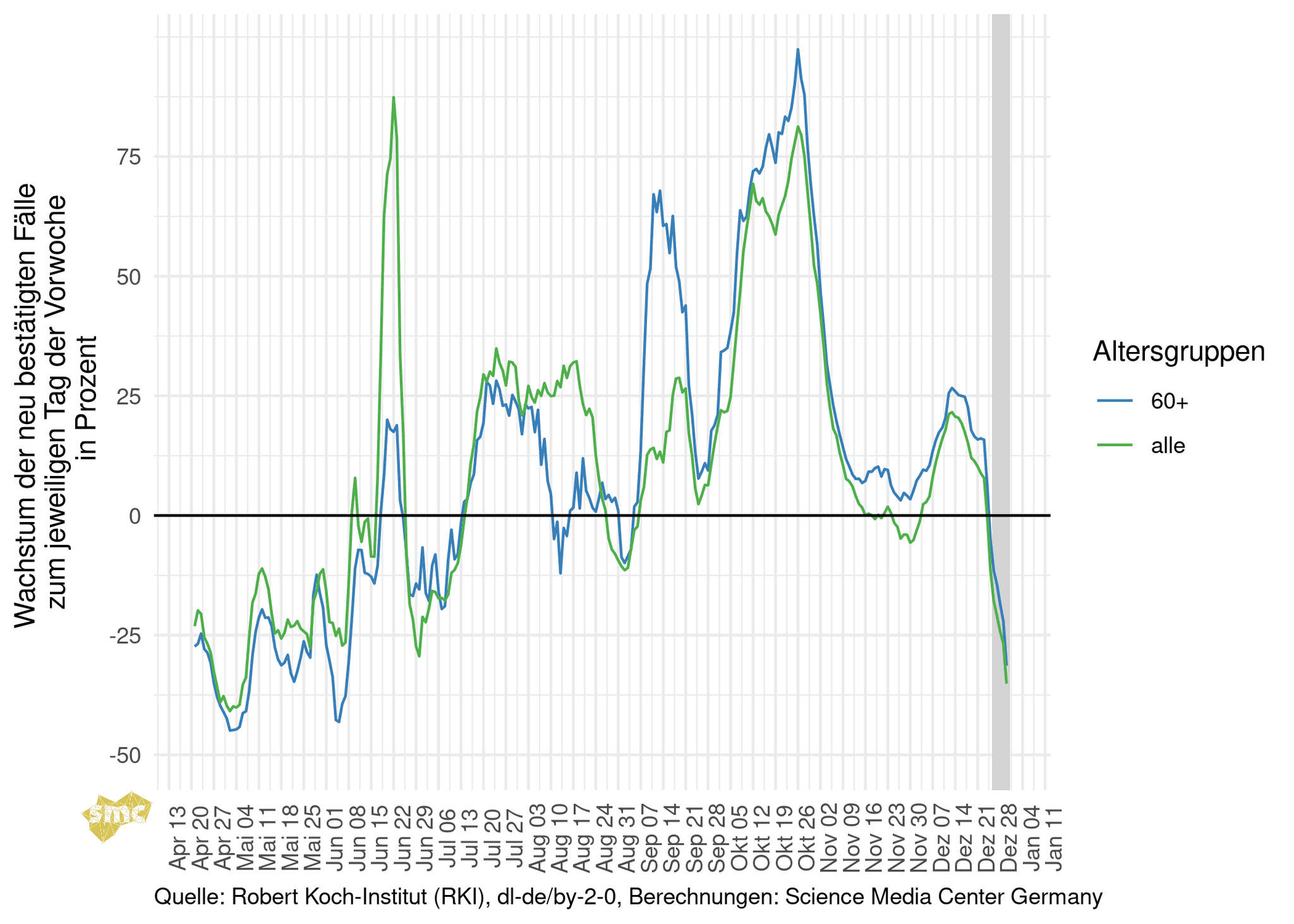 Die Grafik zeigt für jeden Tag das prozentuale Wachstum der geglätteten Fallzahlen im Vergleich zur Vorwoche. Dabei werden einmal alle gemeldeten Fälle berücksichtigt und einmal nur Fälle mit einem Alter von mindestens 60 Jahren. Das wöchentliche Wachstum ist über Weihnachten eingebrochen, da deutlich weniger getestet wurde. In der vergangenen Woche wurden ungefähr ein Drittel weniger Tests als in der Woche davor durchgeführt.