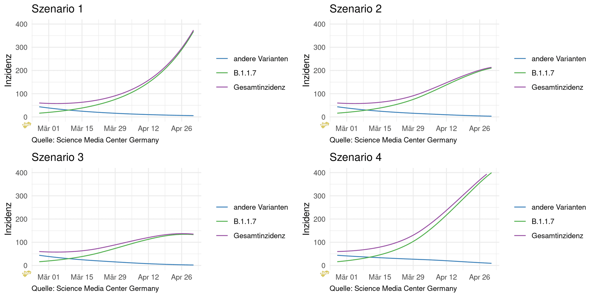 An den Szenarien wird deutlich, dass schon ein leicht gesteigertes wöchentliches Wachstum zu sehr hohen Inzidenzen innerhalb der nächsten Wochen führen kann. Dabei ist das Wachstum von B.1.1.7 ausschlaggebend, da sich diese Variante schneller verbreitet. Ein höheres Wachstum durch Lockerungen oder verändertes Verhalten könnten auch Wachstumsraten verursachen, die schneller verlaufen als die in Szenario 4 dargestellten. Umgekehrt könnte ein saisonaler Effekt das Wachstum stärker bremsen als in Szenario 3 angenommen.