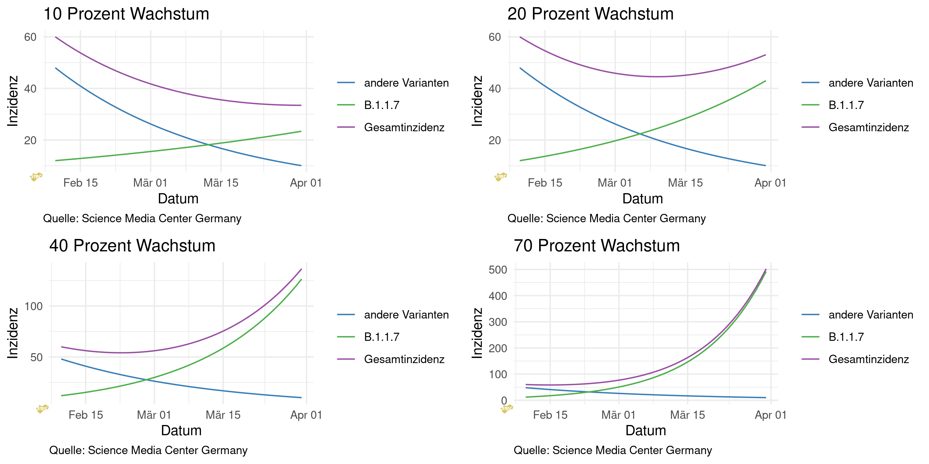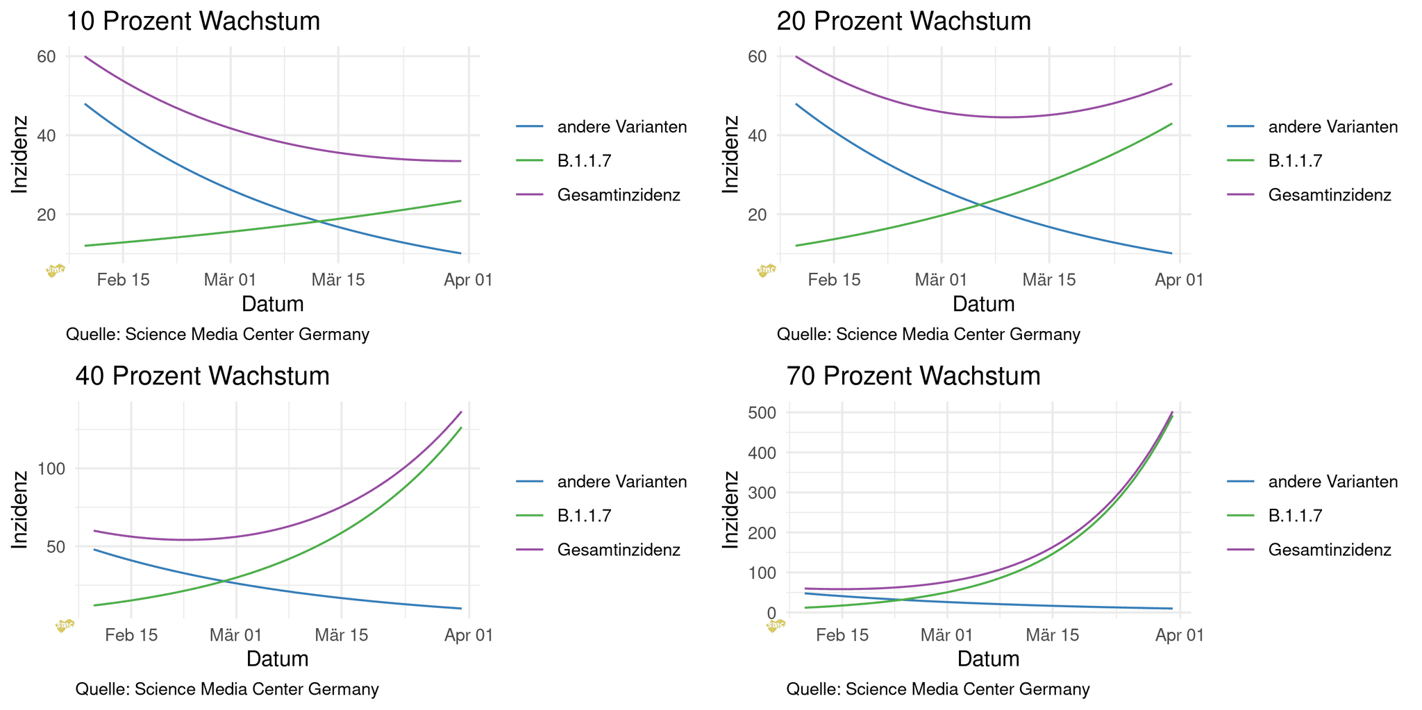 Betrachtet man nun im zeitlichen Verlauf, wie sich B.1.1.7 auf Basis der Basisdaten und verschiedenen Wachstumsraten verbreitet, bekommt man einen Eindruck davon, welche Ergebnisse für Deutschland möglich erscheinen. Unter der Annahme der 10 Prozent Wachstum würden die Fallzahlen insgesamt noch einige Wochen nicht ansteigen, bei 70 Prozent würde dies innerhalb der nächsten Tage geschehen.