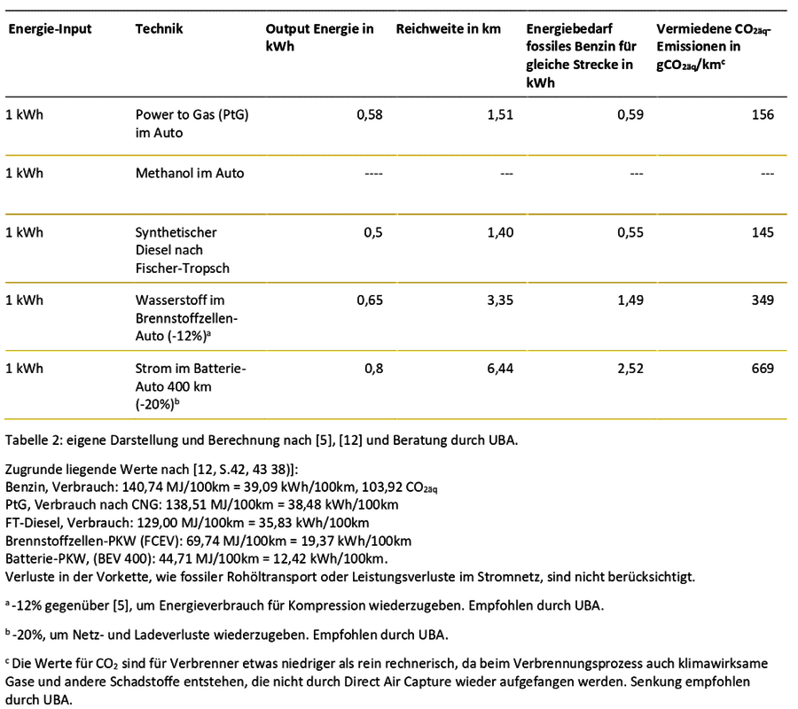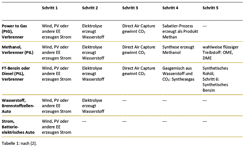 Die folgende Tabelle verdeutlicht, welche Techniken als Ersatz für klassische Verbrennungsmotoren derzeit diskutiert werden, und wie viele Produktionsschritte notwendig sind, bis ein Auto mit dem Treibstoff losfahren kann. Zum Vergleich haben wir die Angaben für Brennstoffzellen- und Batterieautos ergänzt.