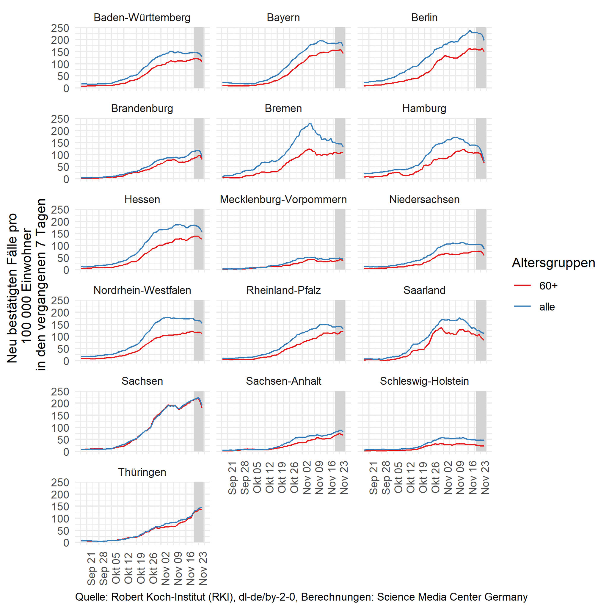 Die Fallzahlen in den Bundesländern sind sehr unterschiedlich. In der unten stehenden Grafik sind die Inzidenzen der Gesamtbevölkerung und der Altersgruppen ab 60 Jahren abgetragen. Während in Mecklenburg-Vorpommern und Schleswig-Holstein die Inzidenz auf einem niedrigen Niveau bleibt, hält sie sich in Baden-Würtemberg, Bayern, Hessen und NRW auf hohem Niveau. In Sachsen und Thüringen steigen die Inzidenzen stark. Auffällig ist hier, dass die Inzidenzen der Altersgruppe über 60 Jahren nahezu identisch zu der der Gesamtbevölkerung verlaufen, in den anderen Bundesländern dagegen deutlich niedriger.