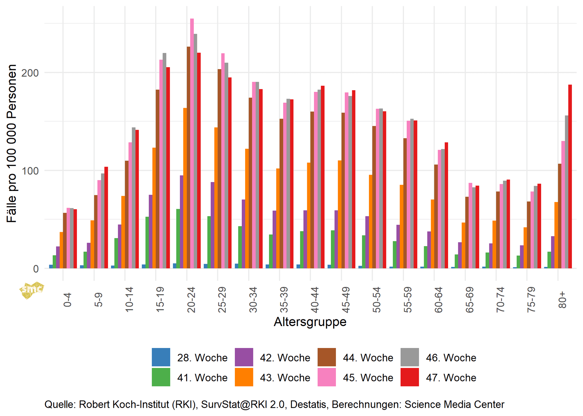 Bei den Personen ab 80 Jahren steigen die Fallzahlen pro 100 000 Personen noch stark, in den Altersklassen um die 20 Jahre sinken sie. Die nächste Woche wird zeigen, ob sich hier unabhängig von der geänderten Teststrategie ein negativer Trend verstetigt.