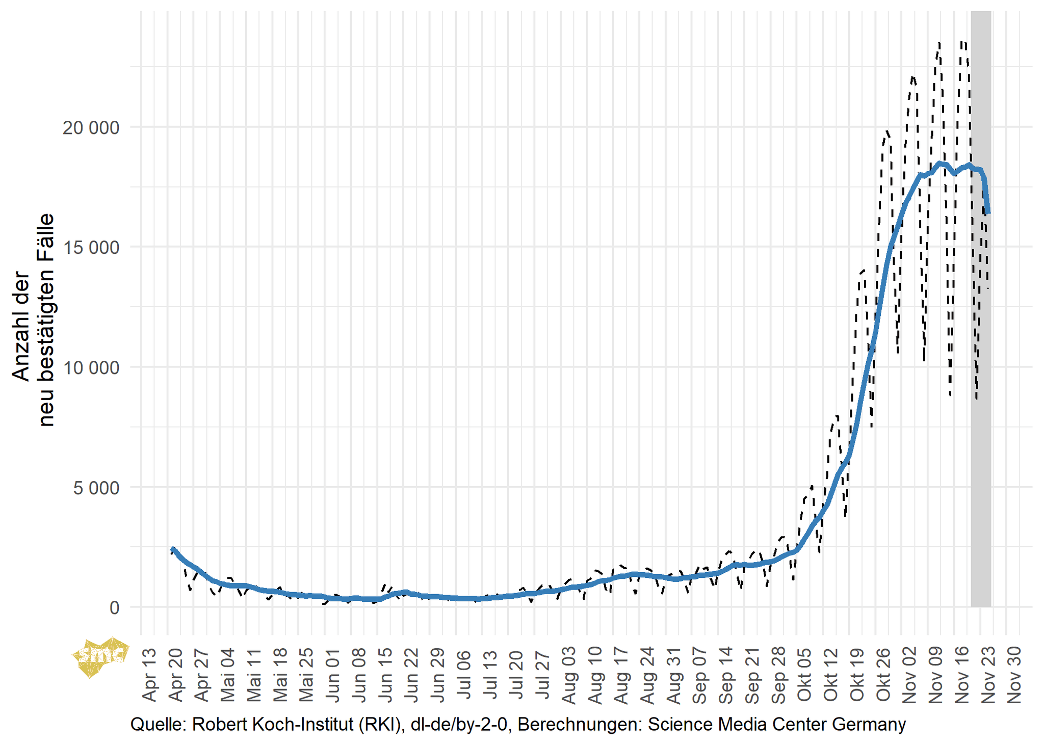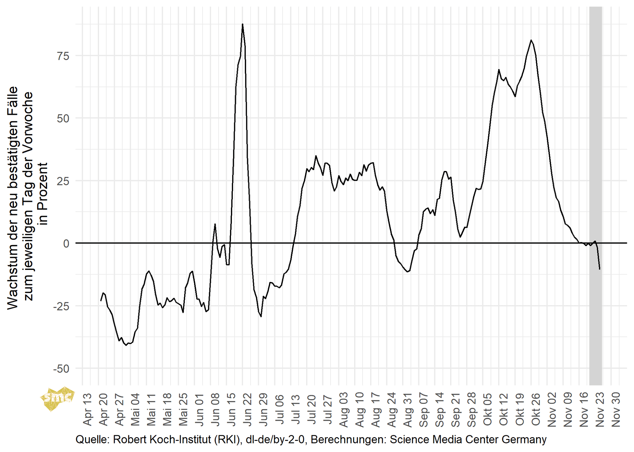 Die Grafik zeigt für jeden Tag das Wachstum der geglätteten Fallzahlen im Vergleich zur Vorwoche. Das Wachstum der vergangenen Woche schwankt um Null, eine Richtung für ganz Deutschland ist gerade nicht auszumachen. Aufgrund der geänderten Teststrategie sind die Zahlen zur Zeit noch stärker als sonst mit Unsicherheiten behaftet. Laut Situationsbericht vom 25.11. ist der Anteil der positiven PCR-Tests an allen Test auf 9,4 Prozent leicht gestiegen.